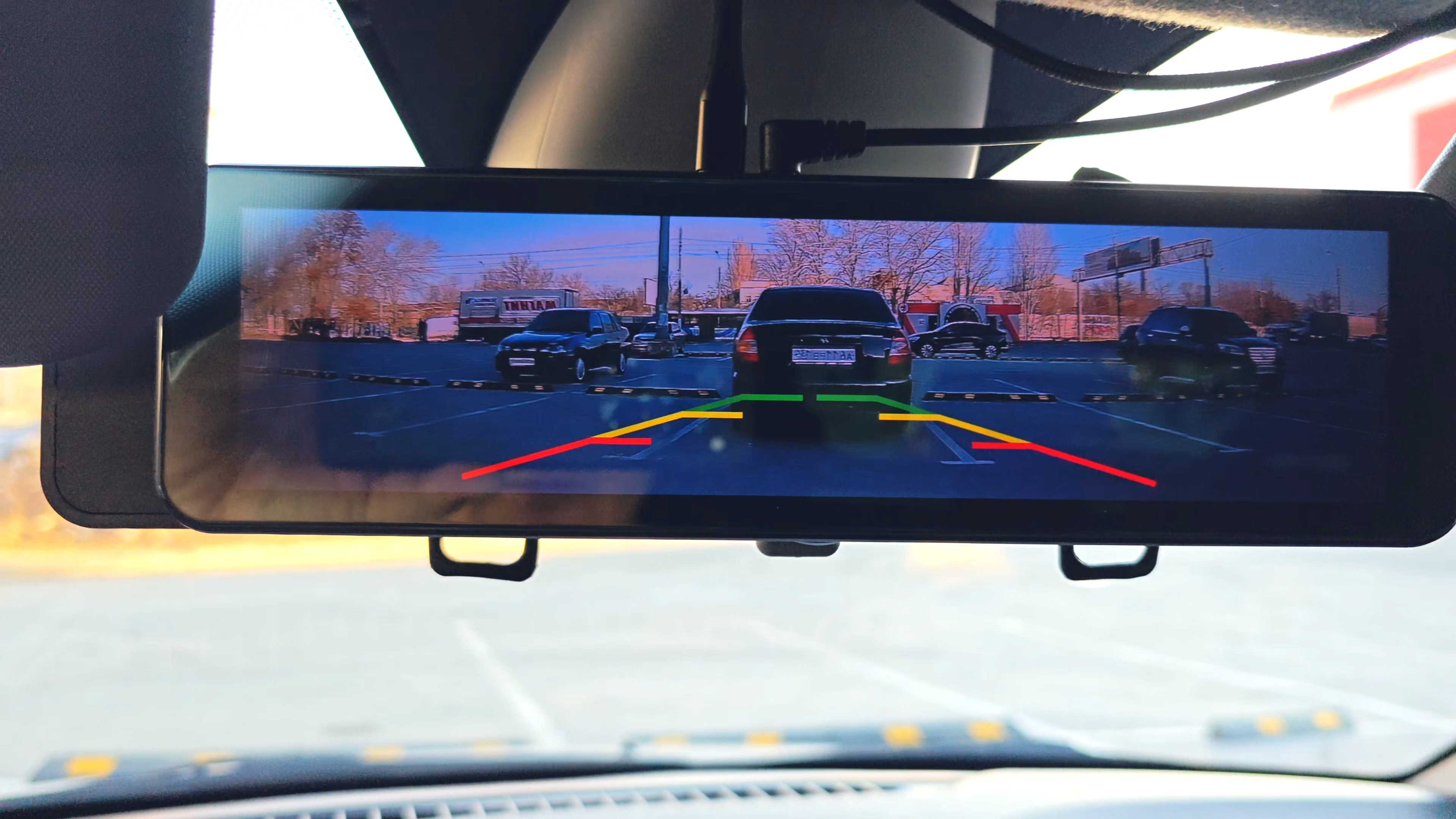 Благодаря дополнительному красному проводу на камере заднего вида зеркало понимает, что включена задняя передача и оно будет автоматически переключаться на видеопоток с задней камеры и дополнительно выводить парковочные линии для удобства и безопасности парковки задним ходом.
