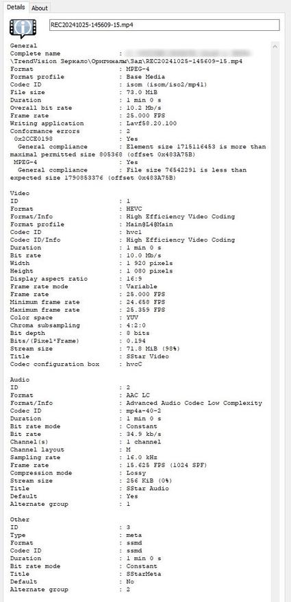 Фреймрейт у неё не 30 кадров в секунду, как на основной камере, а 25, это обычная практика, для задней камеры этого более чем достаточно. Битрейт у неё порядка 10Мб/с, что для Full HD камеры довольно хорошо, больше, чем у аналогичных регистраторов и зажат поток всё тем же h.265 кодеком.