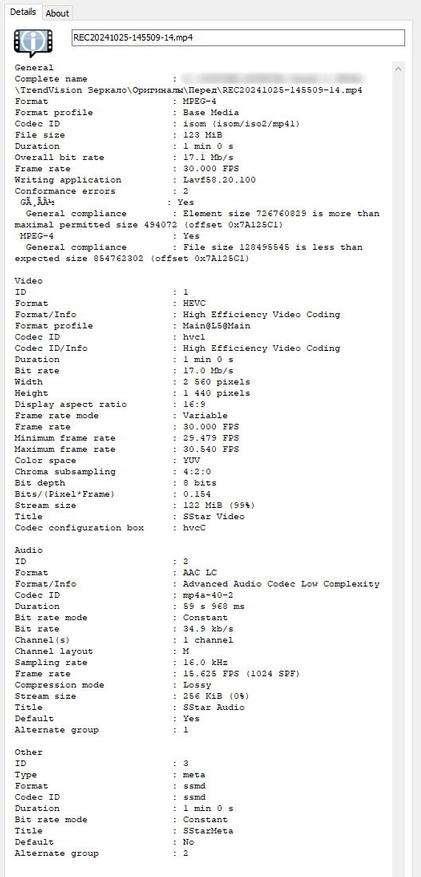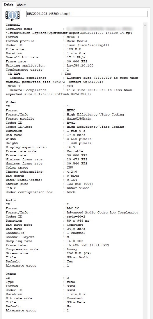 Производитель заявляет разрешение съёмки 4К, но если заглянуть в метаданные видео файлов скачанных с карты памяти регистратора, то увидим, что разрешение не 4К, а 2К — 2560*1440p, можно подумать, что производитель обманул, но нет, во-первых, производитель честно в описании товара указывает, что 4K разрешение это интерполяция, а во-вторых, при задействовании задней камеры разрешение передней основной камеры выше 2К не поднять, что и видно по метаданным. Фреймрейт всегда составляет 30 кадров в секунду, битрейт при 2К разрешении порядка 17Мб/с, что для такого разрешения вполне достаточно, так как зажат поток современным кодеком h.265.