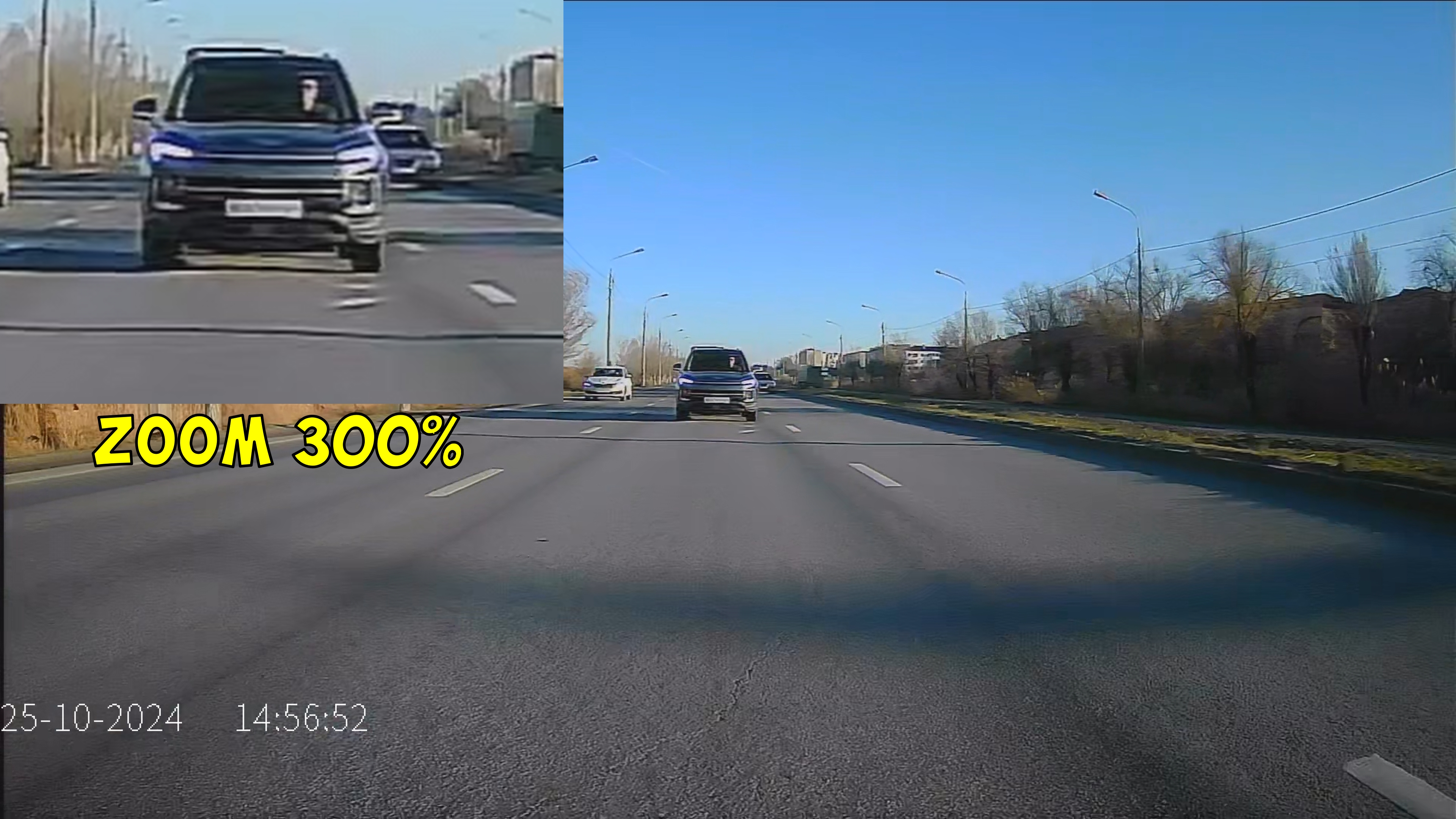 Ниже пример дневной съёмки зеркала-регистратора. На записях отсутствуют координаты и информация о текущей скорости, связано это с тем, что не подключена внешняя GPS антенна, без этого отображаются только дата и время, как на записях с передней основной камеры, так и с задней. Регистратор ведёт запись с обеих камер одновременно, фиксируя всё, что происходит впереди, так и позади автомобиля. Пишутся потоки в разные файлы, друг на друга их наложил я в редакторе для удобства восприятия. Общее качество передней основной камеры довольно хорошее, картинка чёткая, светлая, камера не темнит, WDR, то есть функции расширения динамического диапазона тут нет, да и производитель это не заявлял, но даже так камера снимает весьма неплохо, перекосов по свету не замечено — засветов на ярких участках кадра нет, черноты в тенях тоже.