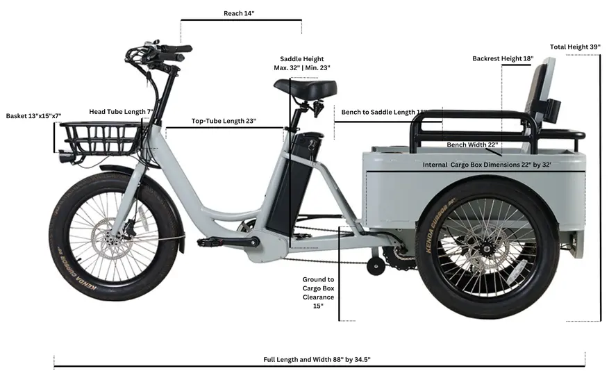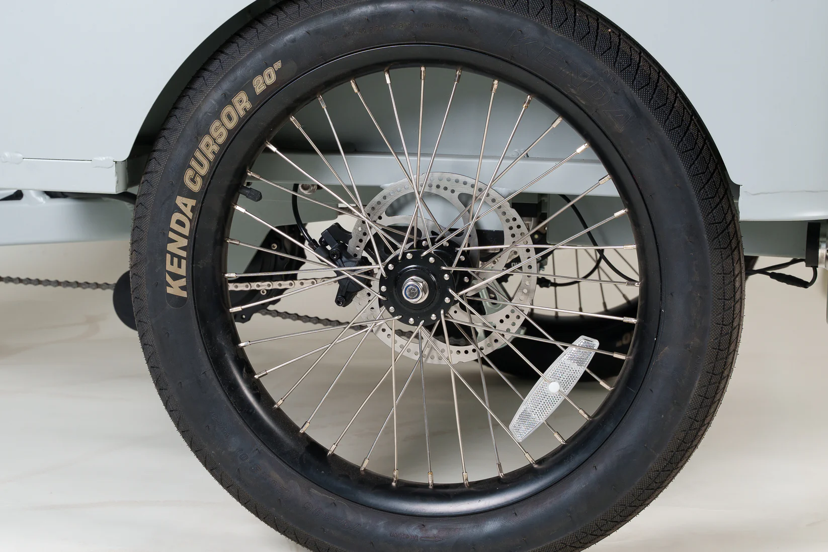 Транспорт оснащен покрышками Kenda K-1270 размером 20x3 дюйма, 7-ступенчатой трансмиссией Shimano Altus, а также передними и задними крыльями. Модель отличается дифференциалом, который обеспечивает передачу мощности на задние колеса для вращения с различной скоростью, необходимой при прохождении поворотов.