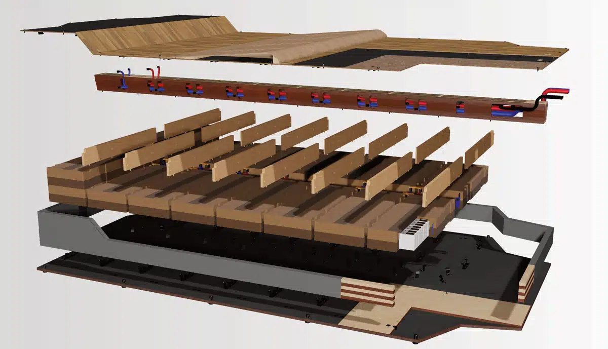 Ключевым элементом разработки стало использование тонкой стальной оболочки с деревянным наполнителем вместо алюминиевых экструдированных профилей. Стальная обшивка приваривается непосредственно к деревянному сердечнику, образуя прочную структуру. Древесина, состоящая из микроскопических ячеек, эффективно поглощает энергию удара при деформации, что критически важно для защиты аккумуляторных элементов в случае аварии.