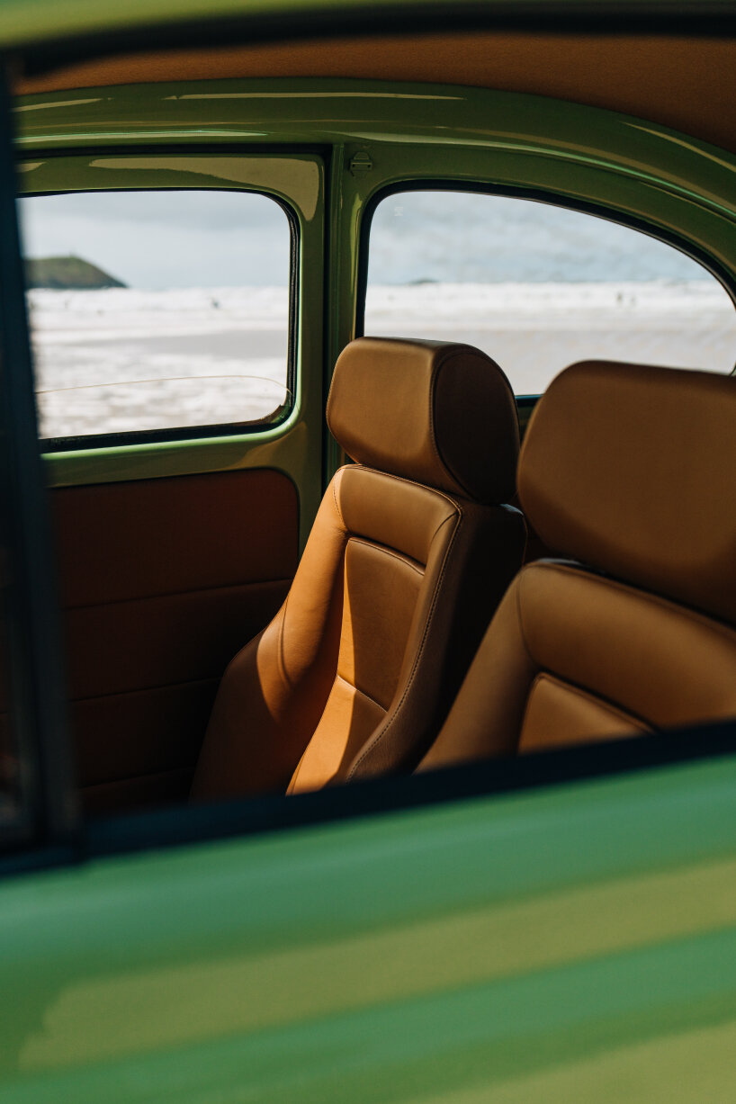Интерьер T-Bug отделывается вручную коричневой кожей, сочетая классический дизайн с современными элементами. Автомобиль оснащается обновленной тормозной системой, светодиодным освещением и современной электроникой.
