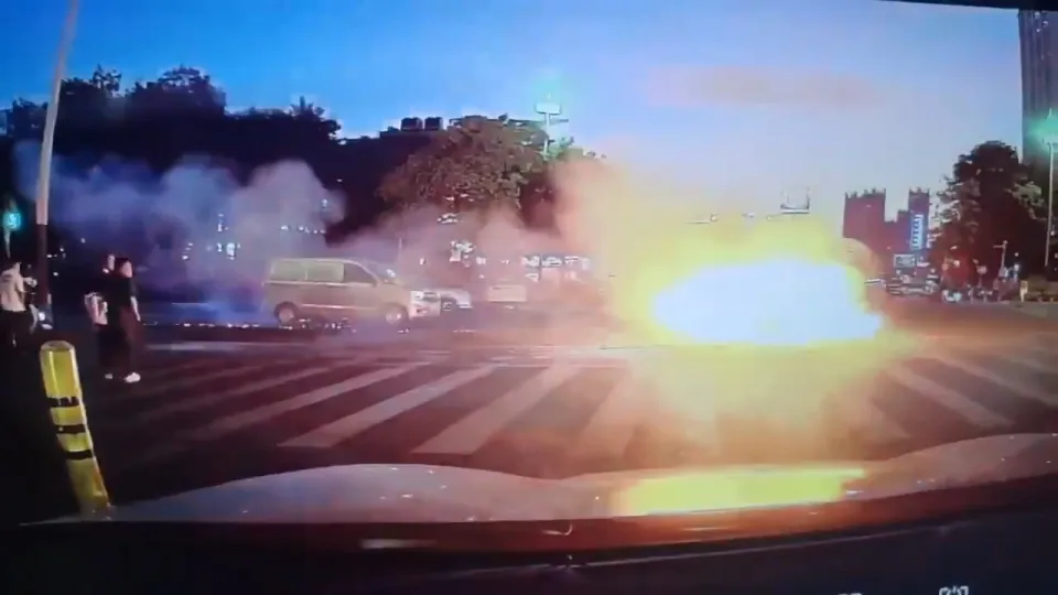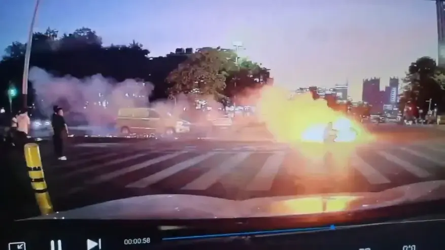 На одном из китайских перекрестков неожиданно вспыхнул электровелосипед курьерской службы, мгновенно превратившись в пылающий шар.