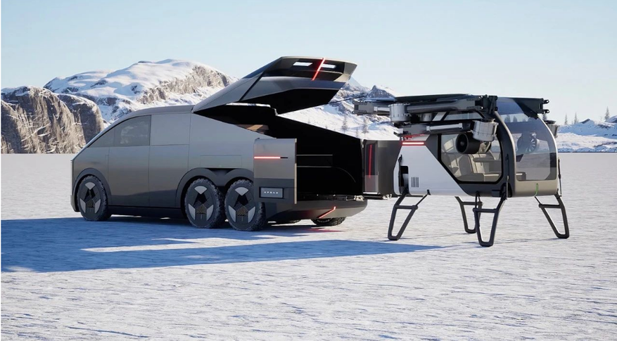 «Наземный авианосец» имеет минималистический кибермеханический дизайн. Его длина около 5,5 м, ширина 2 м и высота 2 м. Он состоит из двух частей: наземного модуля и летательного аппарата. Наземный модуль имеет шестиколесную трехосную конструкцию с полным приводом 6х6 и задним рулевым управлением. В нём большой багажник, способный вместить летательный модуль, и четырехместный салон. Двери двустворчатые с электроприводом. Багажник имеет полупрозрачную стеклянную конструкцию, позволяющую хорошо видеть расположенный в автомобиле летательный модуль. Наземный модуль служит не только мобильной платформой, но и станцией хранения аппарата и пополнения энергии.