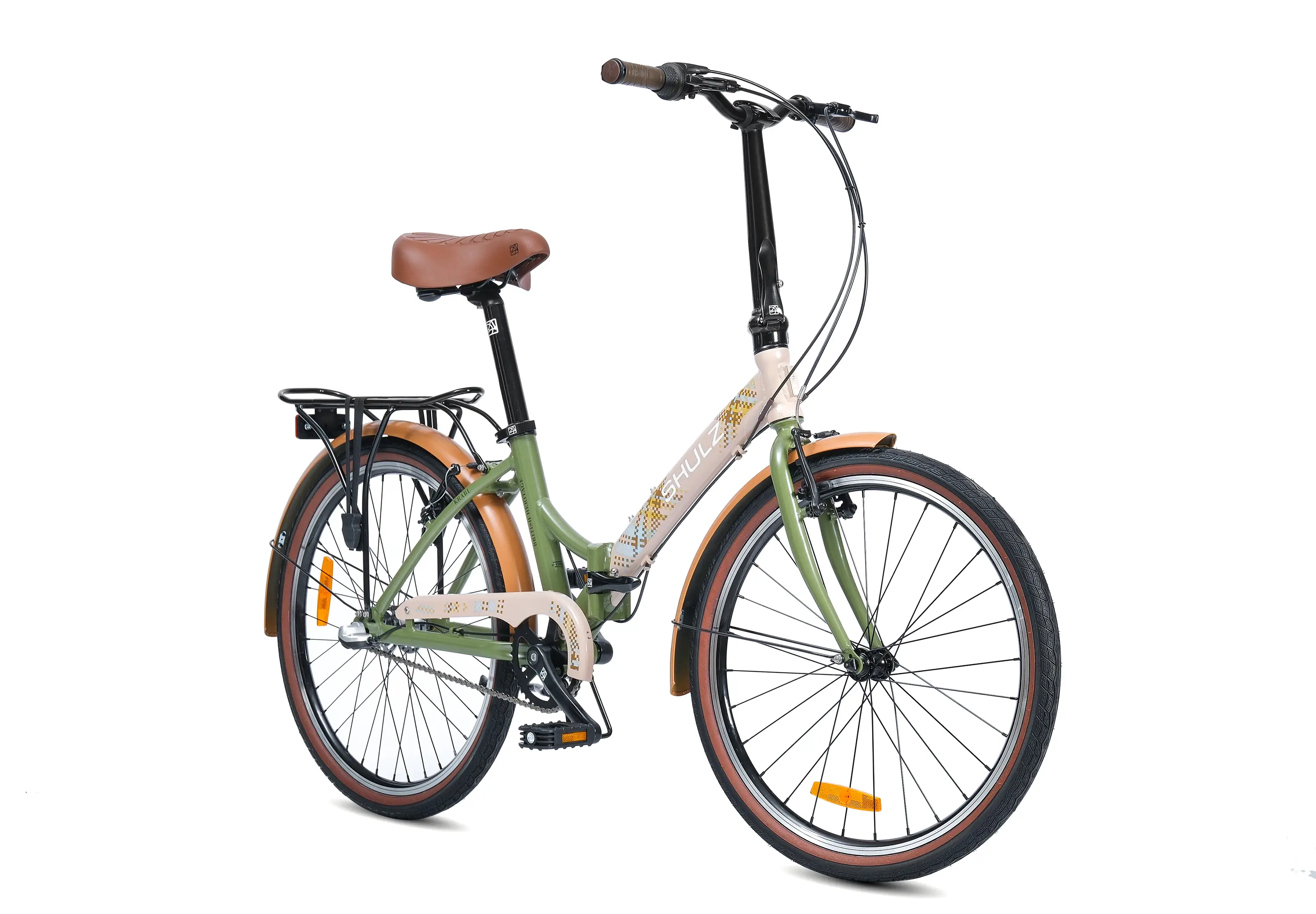 Krabi V-brake является складным велосипедом на 24″ колесах и предназначен для взрослых и подростков ростом 160-200 см. Как и в большинстве велосипедов такого класса от Shulz, используется планетарная втулка Shimano Nexus, а в комплект входят специальные лямки, чтобы надежно закрепить груз на багажнике.