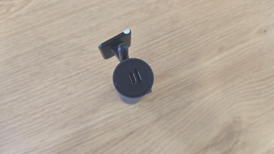 На одной из боковых поверхностей находится кнопка включения/выключения видеорегистратора, обрамленная тонким кольцом с LED-подсветкой, которая сигнализирует о состоянии записи. Зеленый цвет обозначает, что запись активна, красный — ошибка записи, а синий — режим ожидания. Такое цветовое решение функционально, позволяя водителю быстро оценить статус работы устройства.