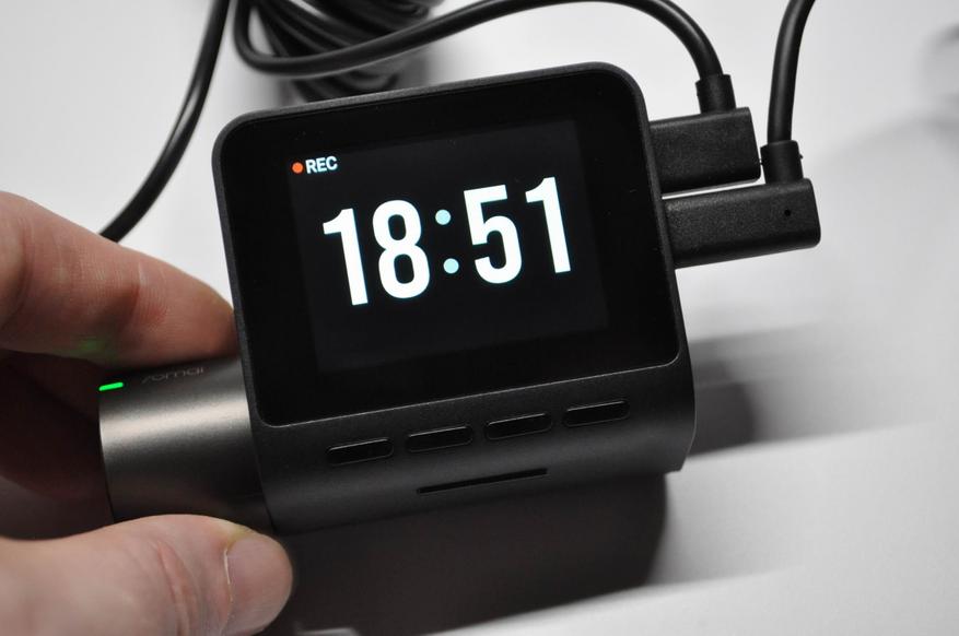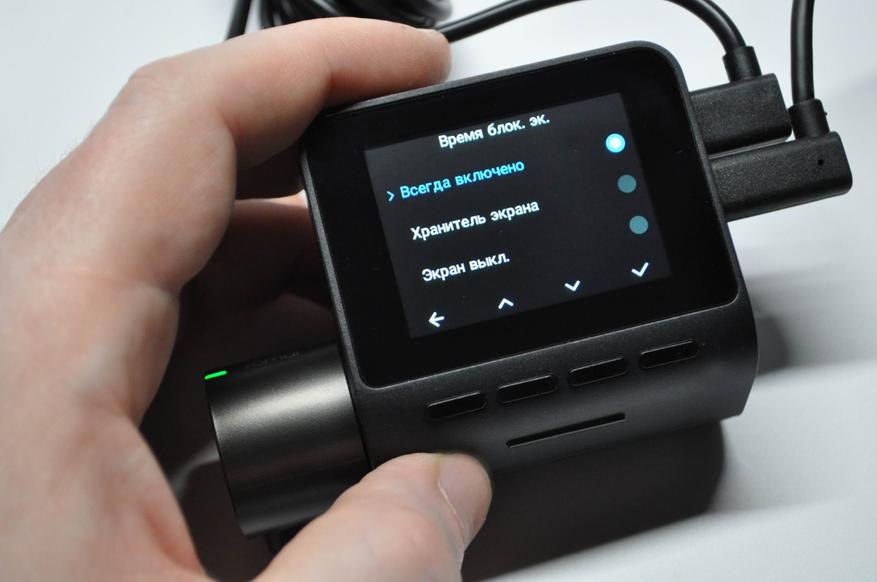 При включении на экране появляется логотип производителя 70mai. Первый запуск занял коло 15 секунд. На экране появляются пиктограммы нужных действий, расположенные над физическими кнопками. Нажимая их, необходимо произвести начальную настройку регистратора: выбрать язык системы и установить дату.