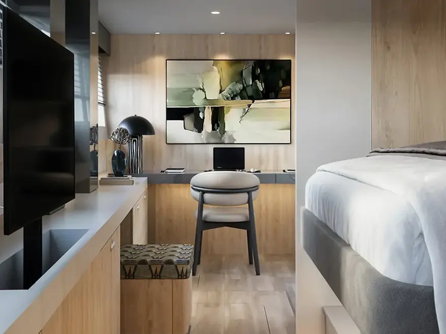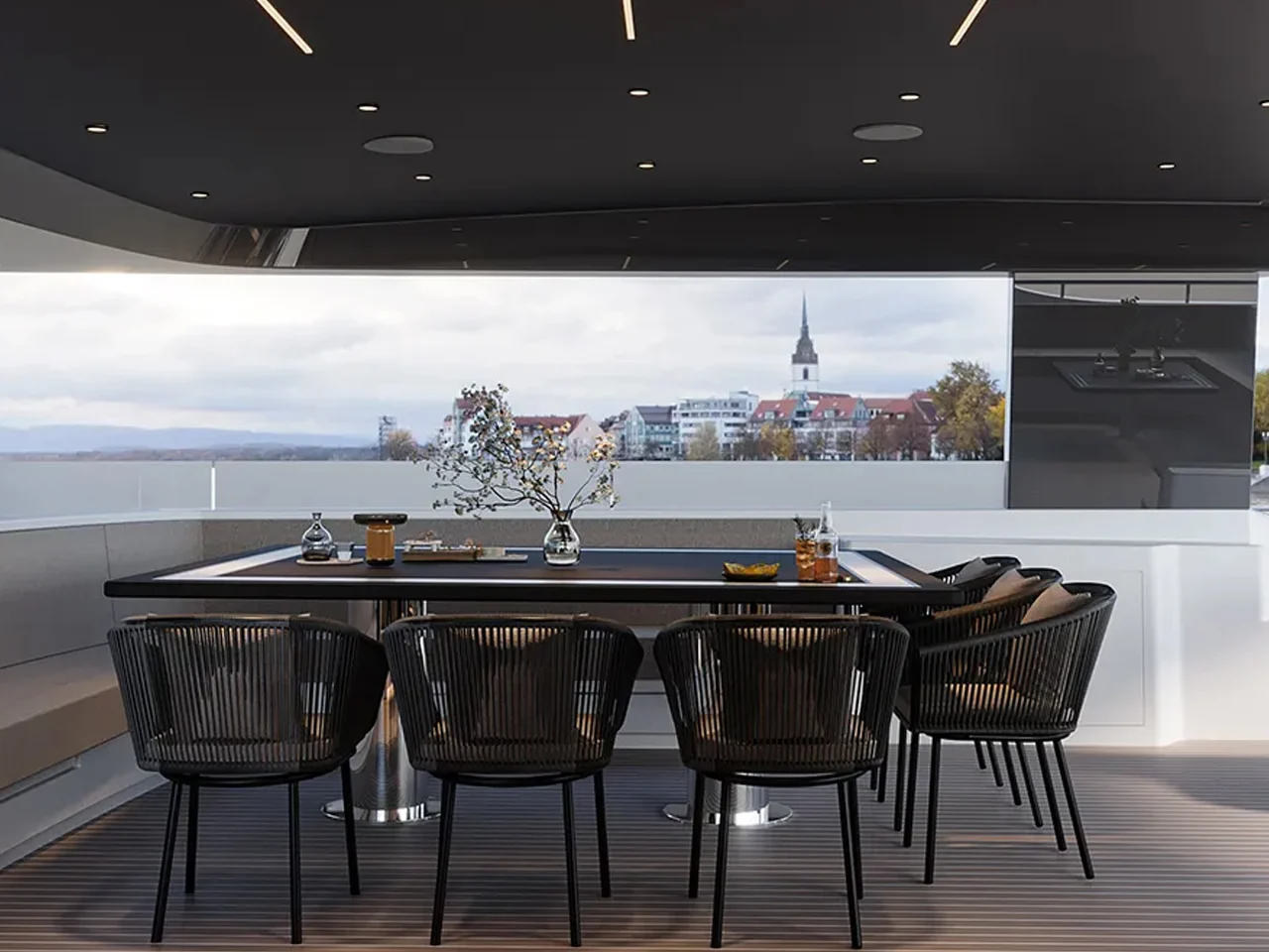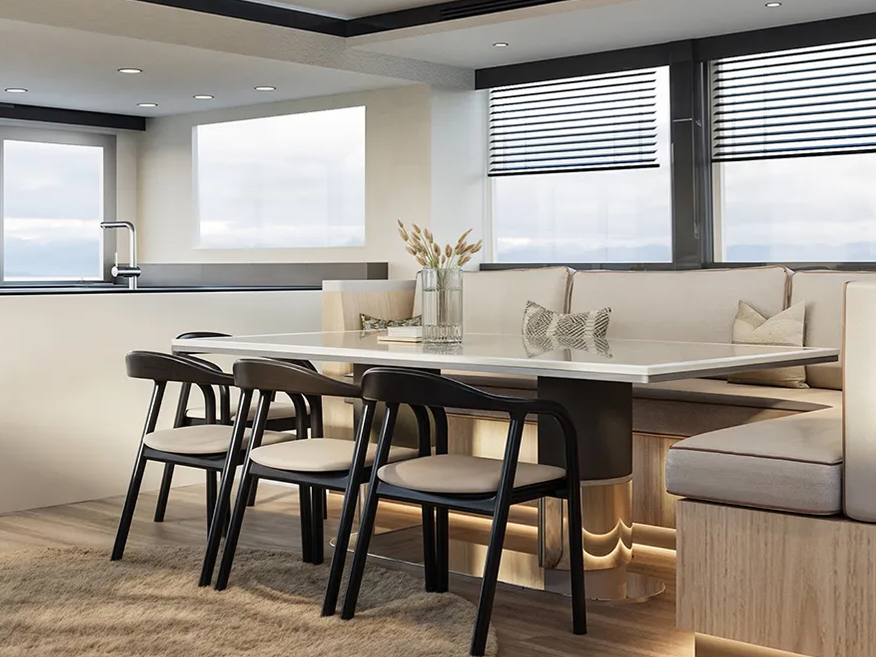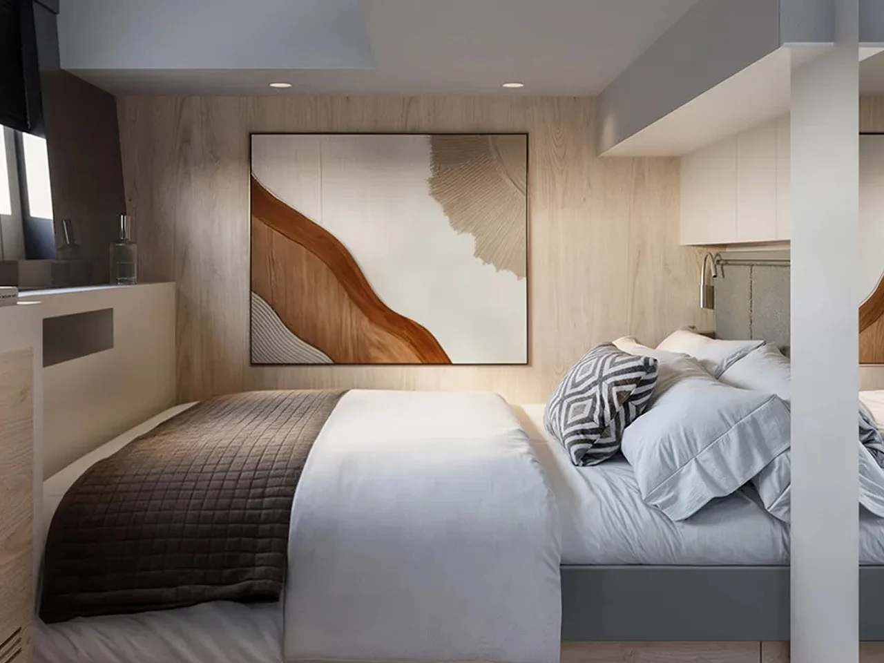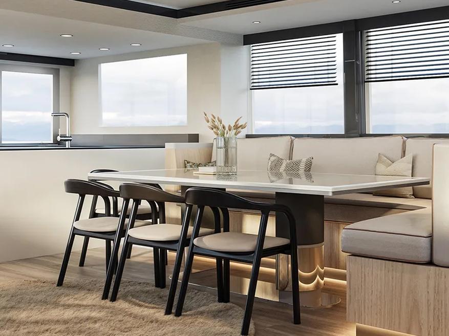 Представленный образец является демонстрационной моделью. Компания предлагает покупателям возможность изменения технических характеристик, внутренней планировки и отделочных материалов под индивидуальные требования. Катамаран оснащен системой управления энергопотреблением.