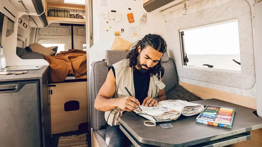 Внутреннее пространство Ibex организовано по классической схеме: спальное место в задней части, обеденная зона в передней части и кухонный блок со стороны пассажира. Санузел расположен между обеденной зоной и задней частью. Интерьер выполнен в природных тонах с использованием нейтральных и светлых древесных оттенков, стеновых панелей под мрамор и фетровых элементов.