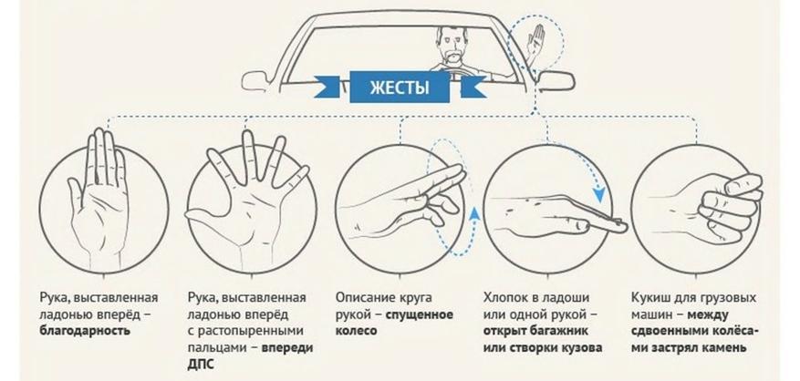 Выставленная вперёд ладонь — приветствие или благодарность. Если пальцы ладони растопырены, это означает, что впереди засада инспекторов. Описание в воздухе круга рукой — одно из колёс спущено. Удар ладонью по воздуху — открыт багажник. Рука показывает на обочину, значит нужно остановиться, у вас неисправность.