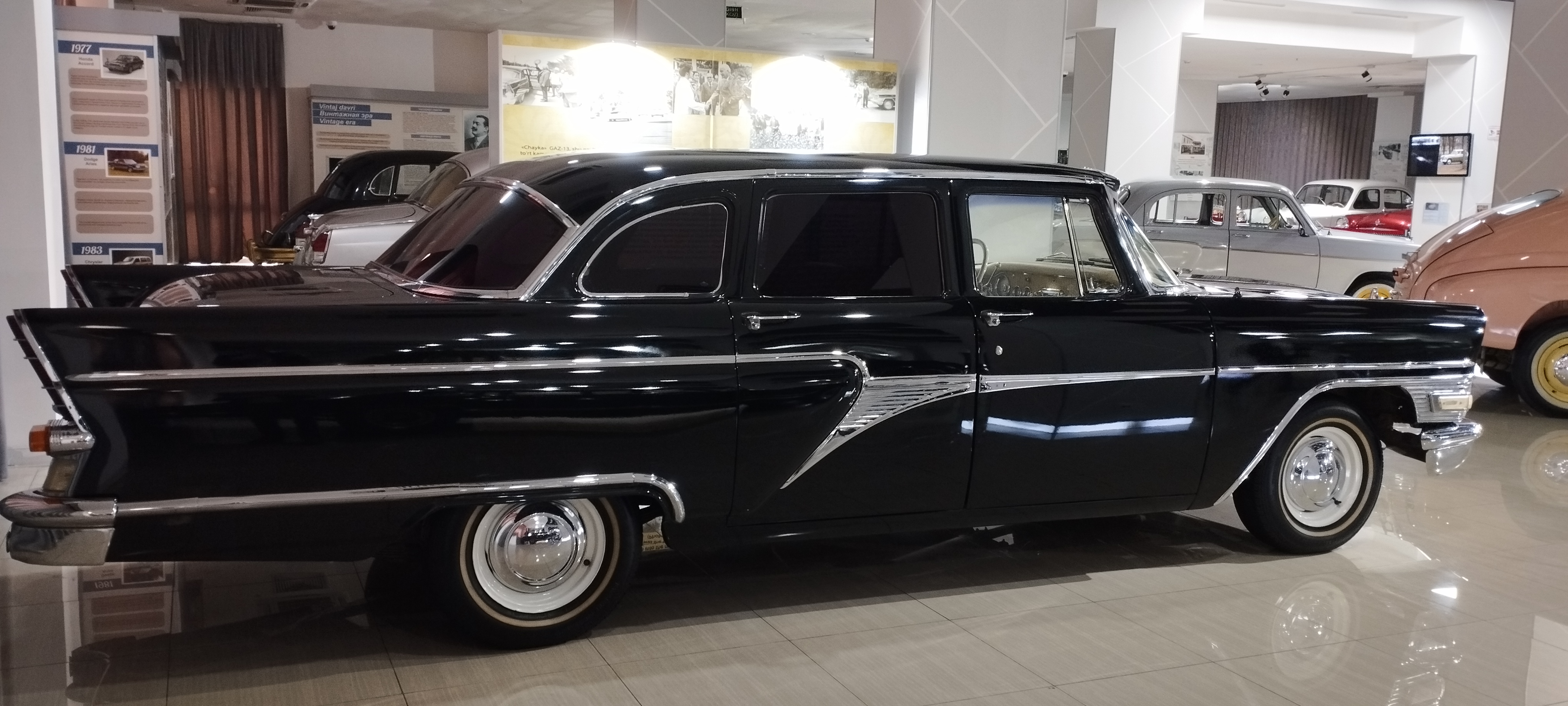 Массивные хромированные бамперы, обилие хромированных молдингов и декоративных элементов создавали образ роскоши и статусности. Панорамное ветровое стекло, модное в 1950-х, визуально расширяло пространство салона и придавало автомобилю футуристический вид. Все эти элементы должны были внушать уважение и трепет — как советским гражданам, так и иностранным наблюдателям.