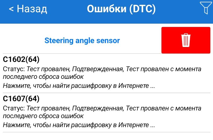 Выполняем чтение ошибок — у меня в данном случае висит ошибка по расхождению показаний датчика положения рулевой системы. После проверки (сход-развал) сбрасываем ошибку сканером (красная кнопка с «корзиной»). Если по слесарной части сделано все корректно, то ошибка больше не появится.