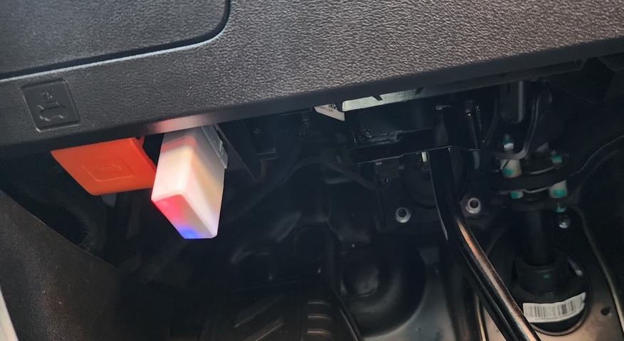 Использовать более чем просто подключаем к диагностическому OBD-разъему автомобиля. Найти этот самый разъем можно в районе рулевой колонки или блока предохранителей, иногда в быстром доступе, иногда под панелями. Совсем редко бывает в районе «бардачка» — этот момент сильно зависит от модели авто. Практически ко всем современным автомобилям подходит без переходников. Отмечу индикацию работы: красный «питание» и синий «связь со смартфоном».
