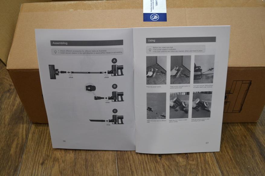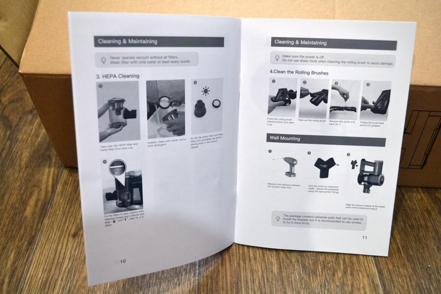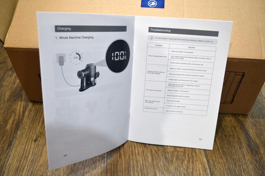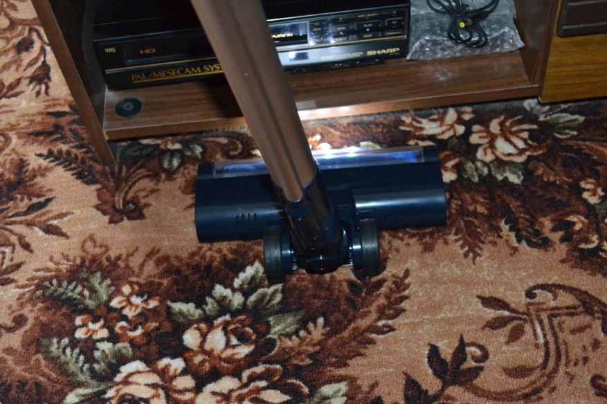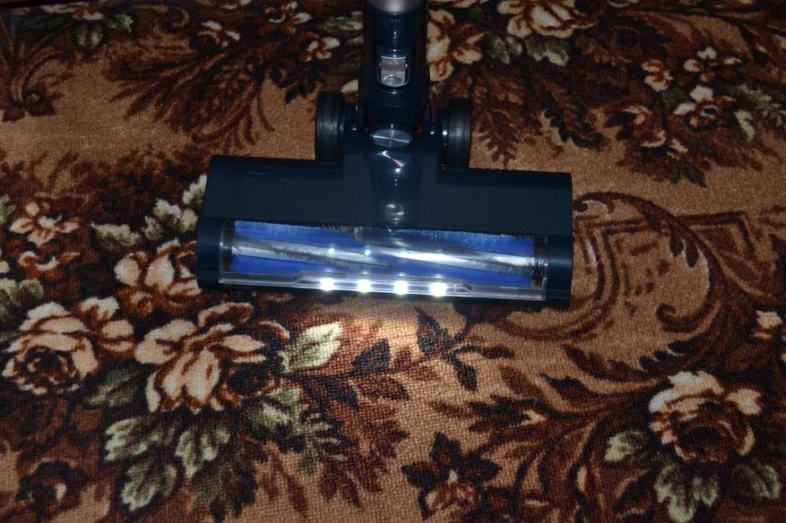 Из коробки пылесос заряжен на 60%. Заряда хватило пропылесосить под диваном, холодильником, морозильной камерой, полкой со старым видеоплеером и пройтись по паре собачьих ковриков.