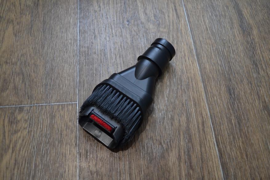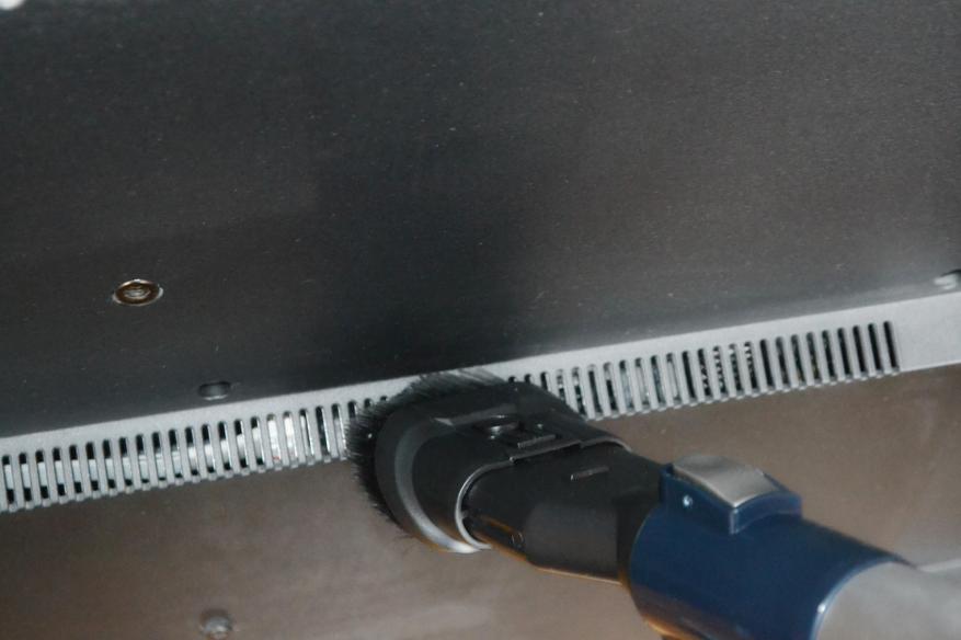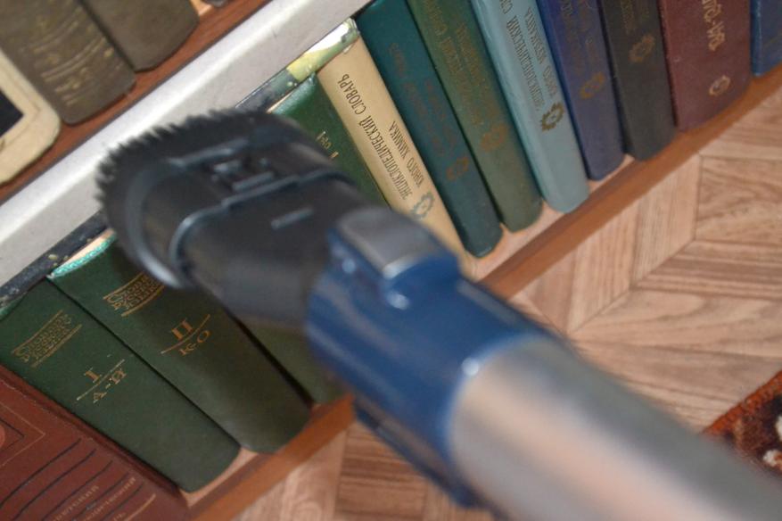 Первой была испытана мебельная щетка. Неудачная выдвижная конструкция со слабым фиксатором. Малейшее нажатие на щетину приводит к срыву с защелки. Корешки книг пропылесосить еще можно, но вот вентиляционную решетку телевизора лучше щелевой насадкой.