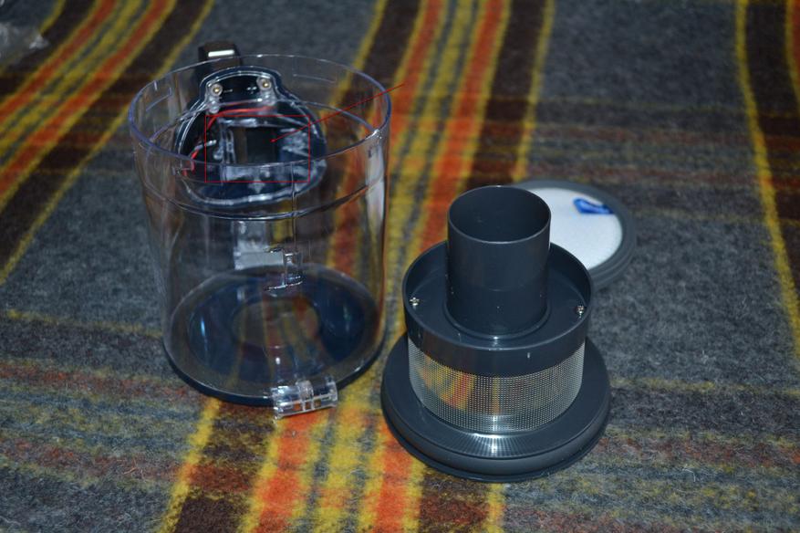 Тело пылесоса состоит из двигателя и прозрачной колбы для сора. Колба оборудована примитивным обратным клапаном из куска резины. Выброс мусора возможен через откидную крышку или съемом колбы. Кнопка сброса колбы расположена неудобно и не утоплена в корпус, что может привести к случайному сбросу с мусором на пол. Снятая колба устанавливается в паз и автоматически фиксируется с щелчком фиксатора. Здесь тоже момент. Обозначения на колбе выдавлены мелкие, малозаметные. Не помешала бы яркая наклейка с обозначением замка и указания направления движения для фиксации.