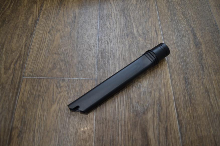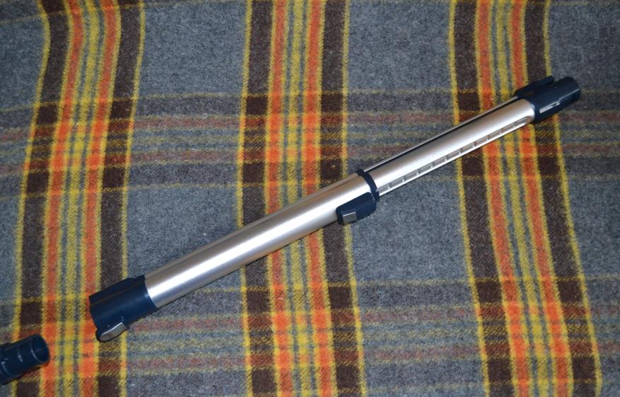Перед сборкой нужно удалить с колбы 2 транспортировочных ленты и начать сборку с присоединения телескопической трубки. Трубка раздвигается от 42 до 65 см. Соединяем "соблюдая полярность" папу с мамой на трубе и пылесосе.