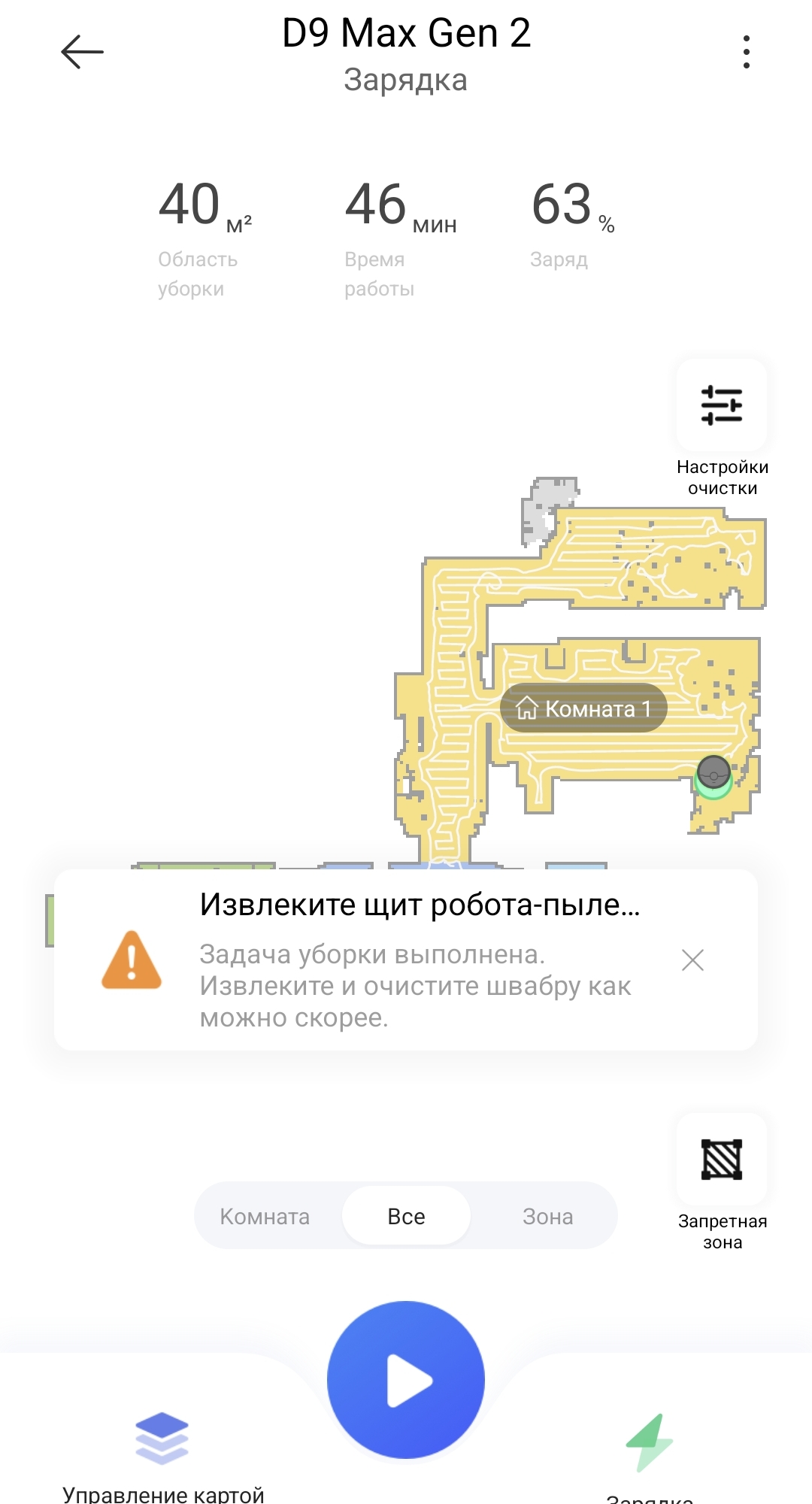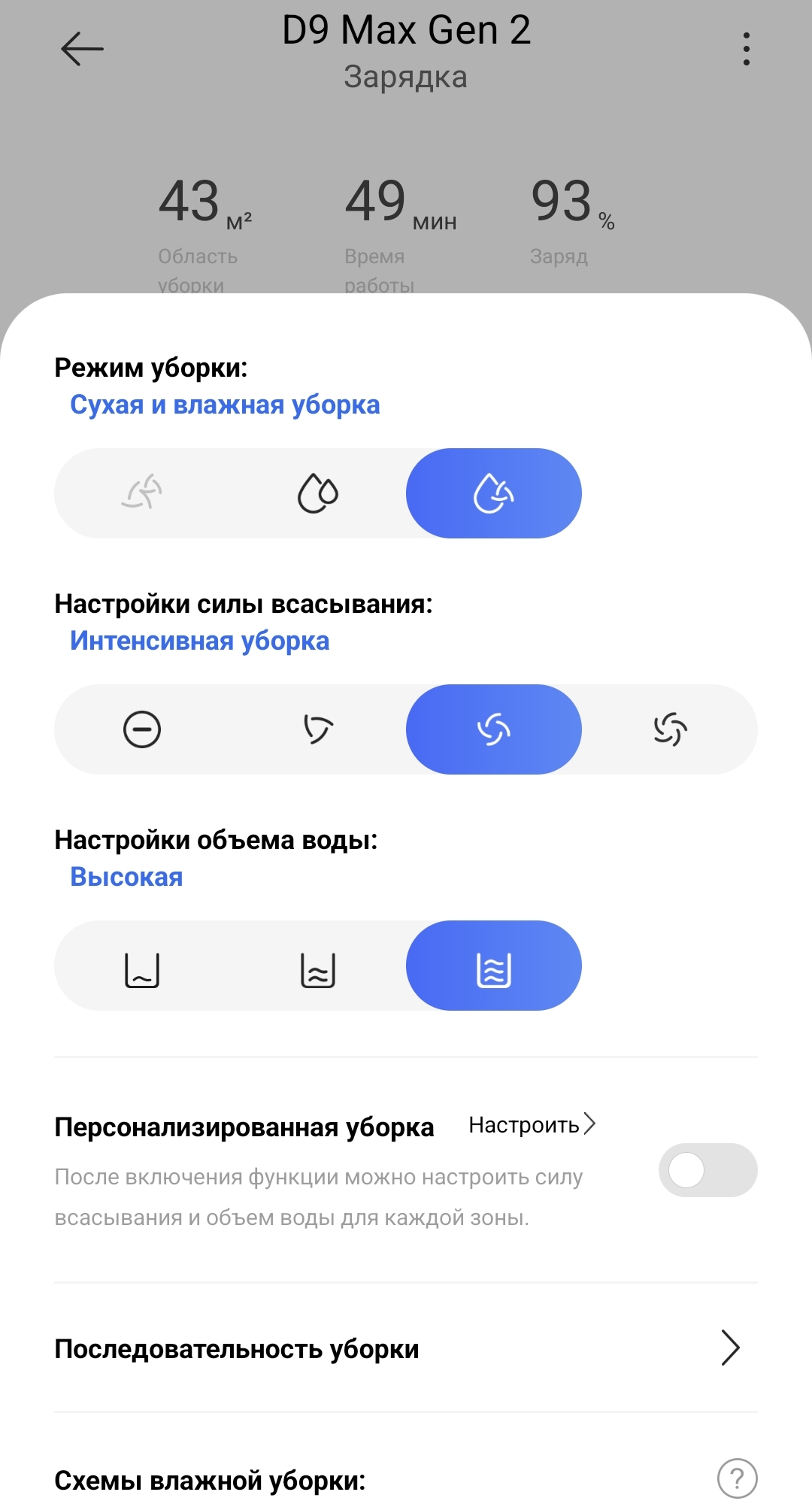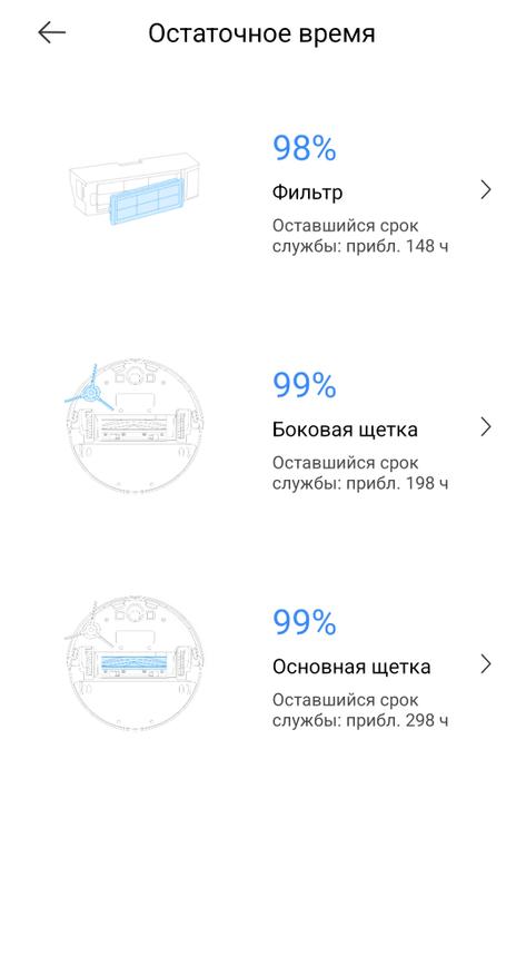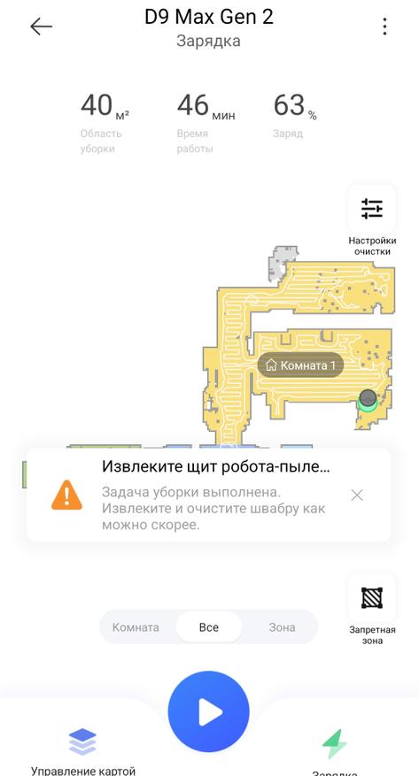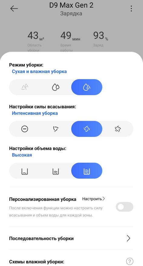 Комбинированная уборка занимает в среднем 0,9 минуты на 1 квадратный метр пола, при этом расходуется примерно 1% процент заряда аккумулятора (емкость 5200 мАч).