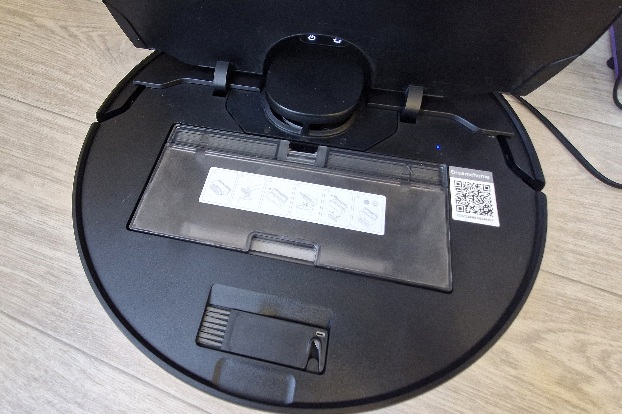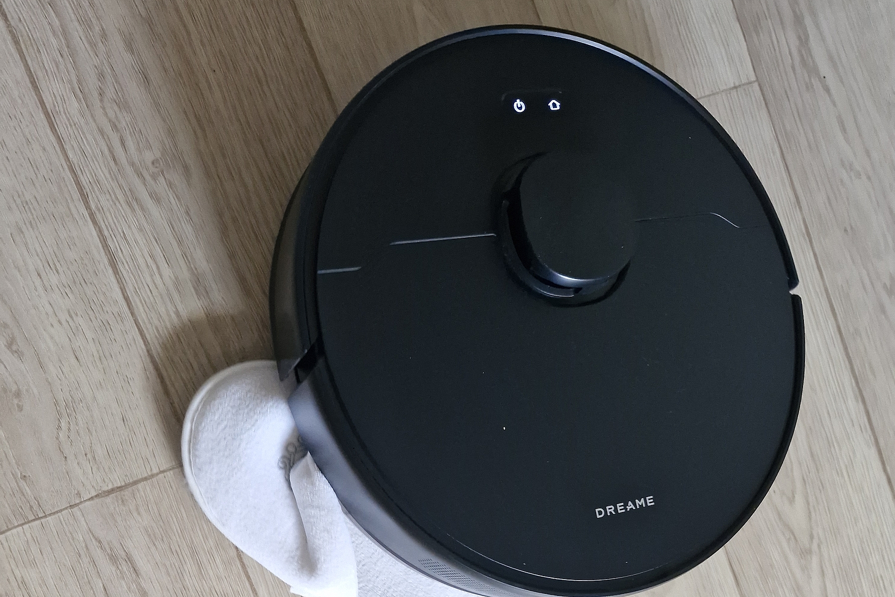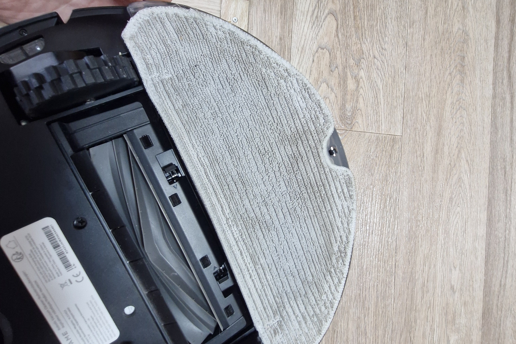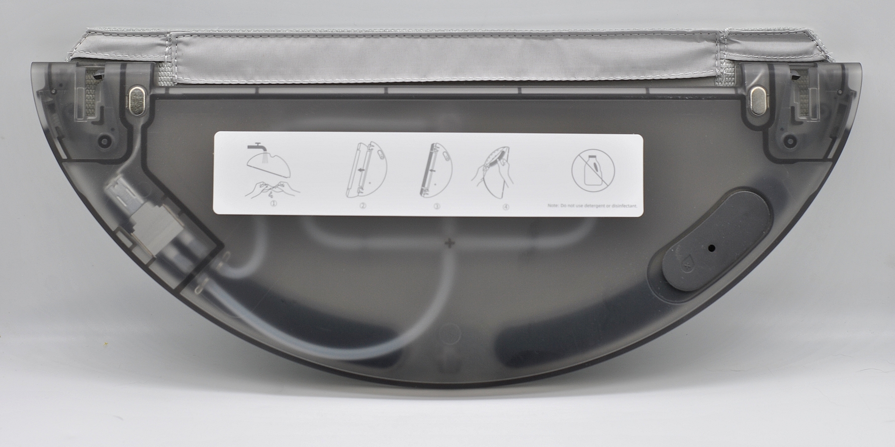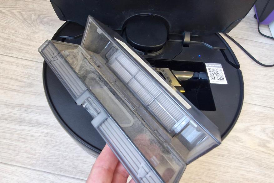 Объем воды небольшой (меньше стакана), подъема блока и вибрации нет, основная функция влажной уборки тут — простое протирание пола. Салфетка легко снимается для стирки. Сам контейнер защелкивается на корпус робота и дополнительно удерживается магнитиками. Воду лучше заливать фильтрованную, отверстия очень маленькие, чтобы не забились.