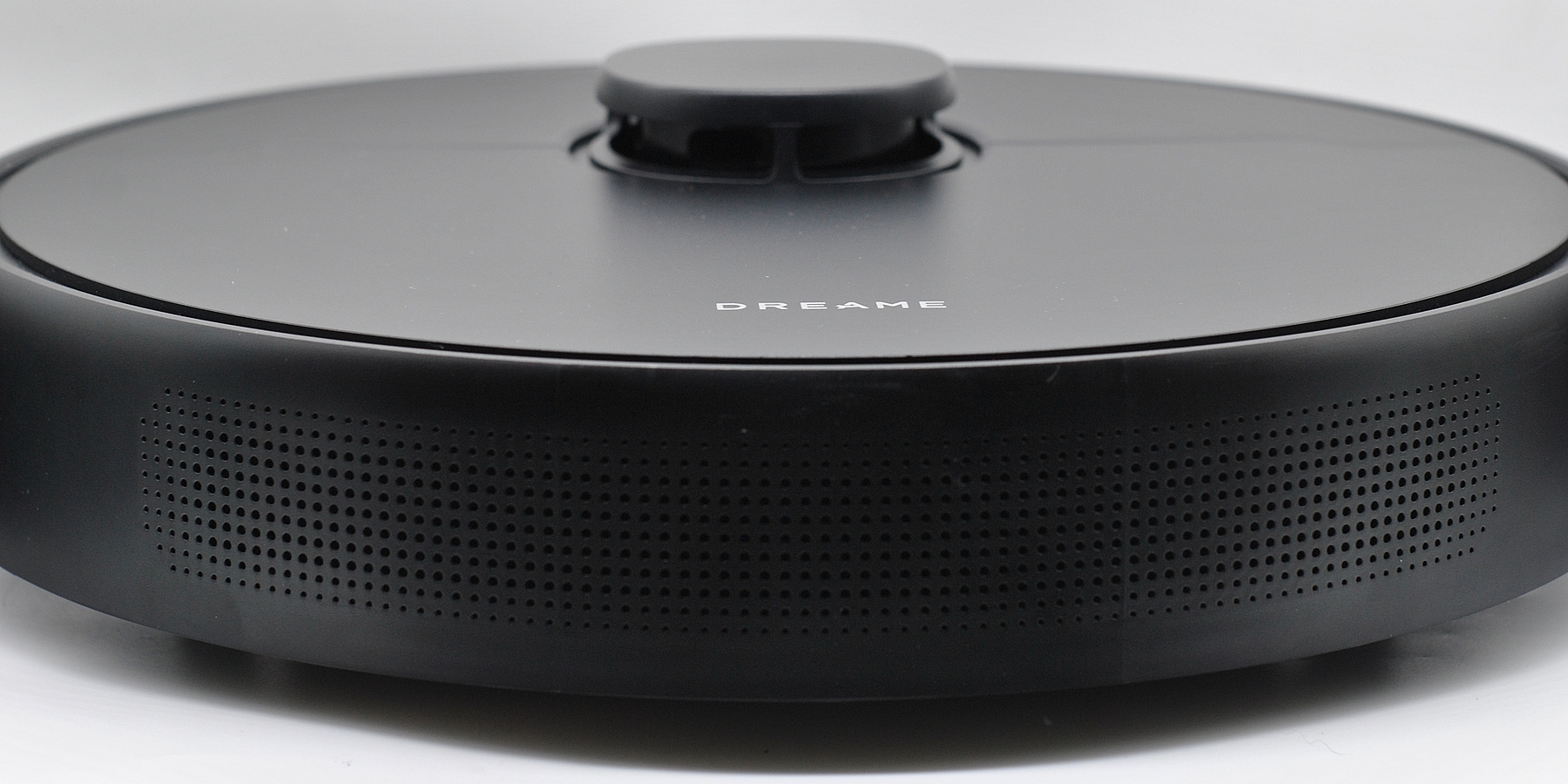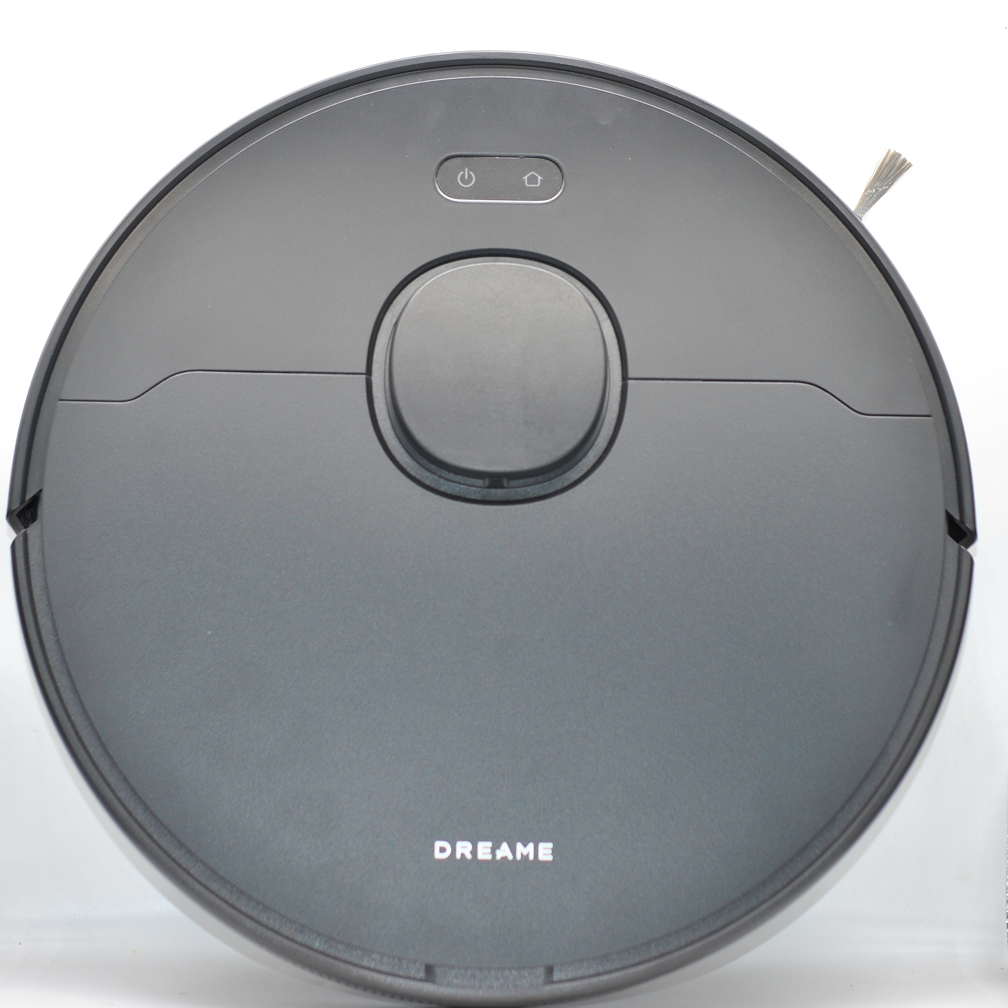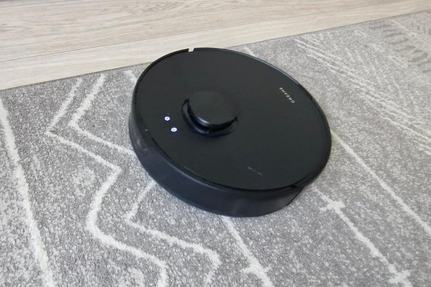 Пылесос Dreame D9 Max второго поколения выполнен в круглом пластиковом корпусе. Сверху торчит башенка поворотного лидара (увеличивает высоту корпуса на 2 см), в остальном дизайн типовой для многих брендов. Есть пару кнопок с подсветкой для главных функций. Общая высота корпуса 9,5 см.