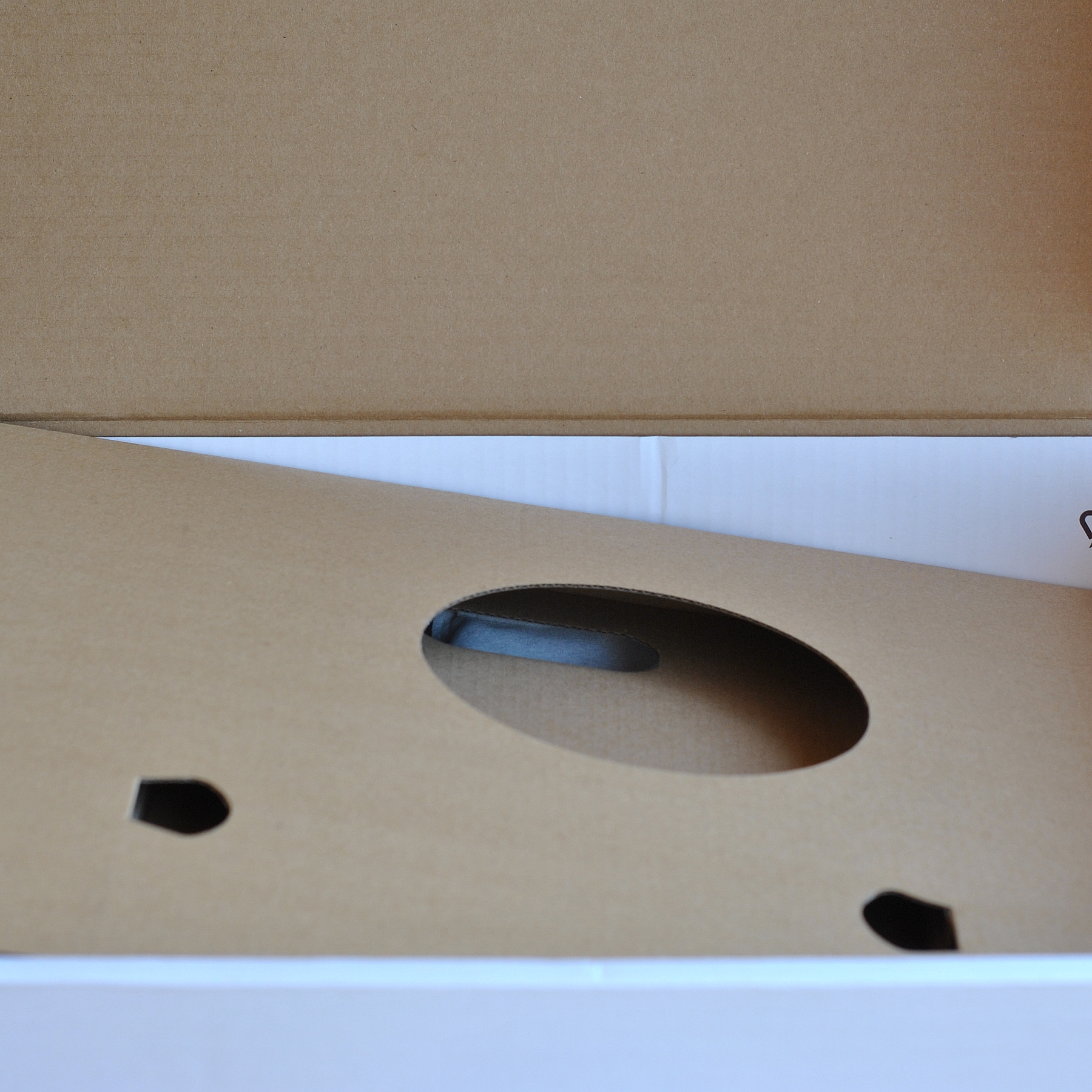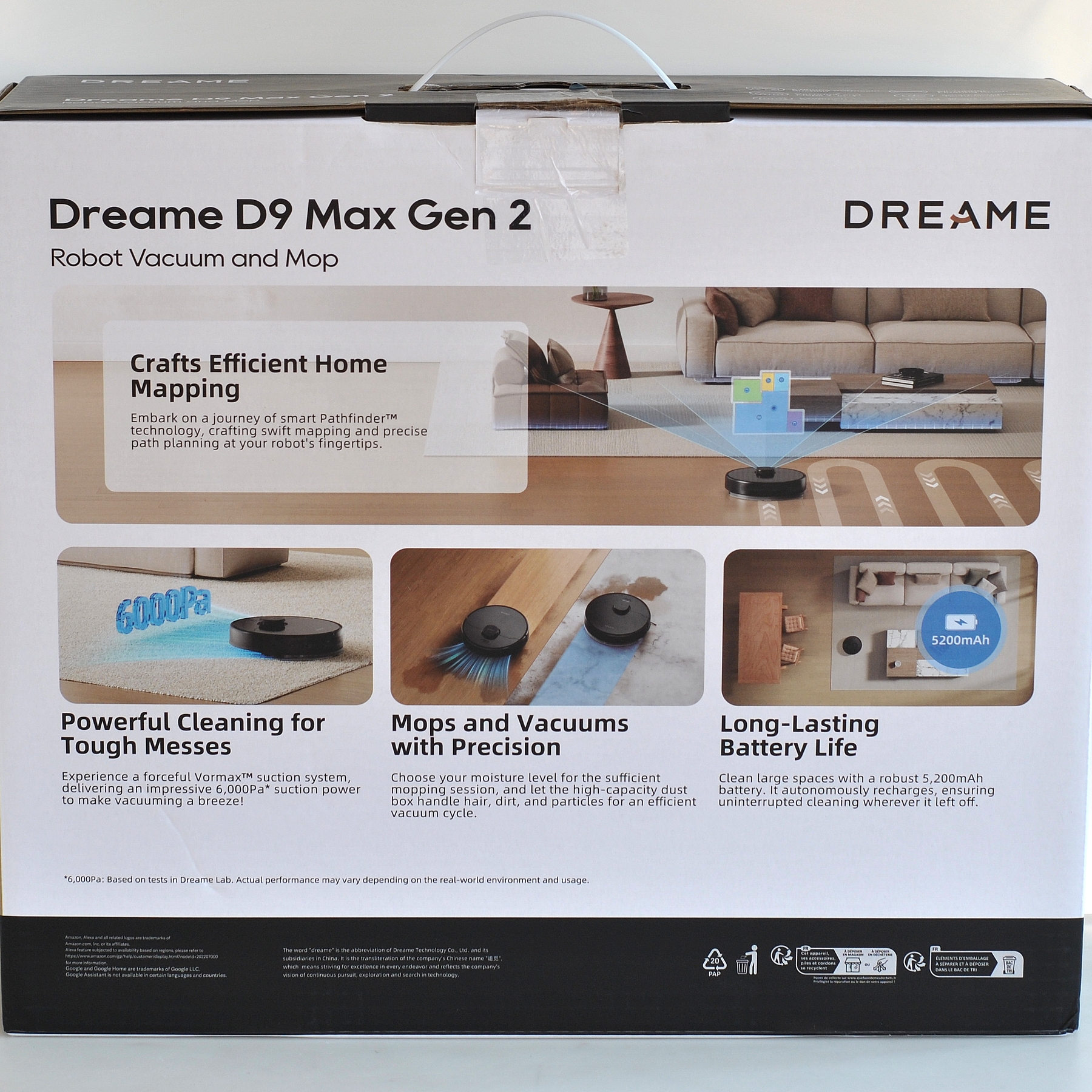 Робот — пылесос попадает к пользователю в надежной упаковке из пары коробок: одна транспортная, вторая коммерческая с цветными изображениями. Есть пластиковая ручка для переноски. Надписи на английском (у меня версия EU). Внутри развитые картонные вставки.
