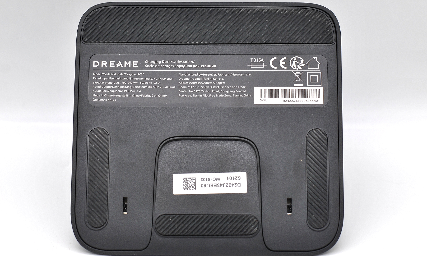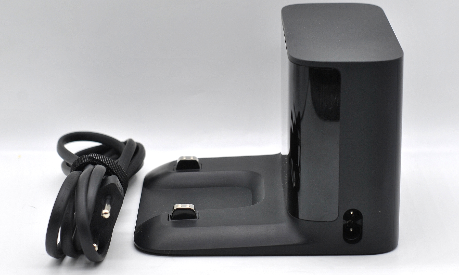 Тут в комплекте станция только для зарядки, без самоочистки (модель все-таки средней ценовой категории). На полу не скользит благодаря резиновым накладкам. Контакты подпружинены. Длина сетевого кабеля 1,5 м.