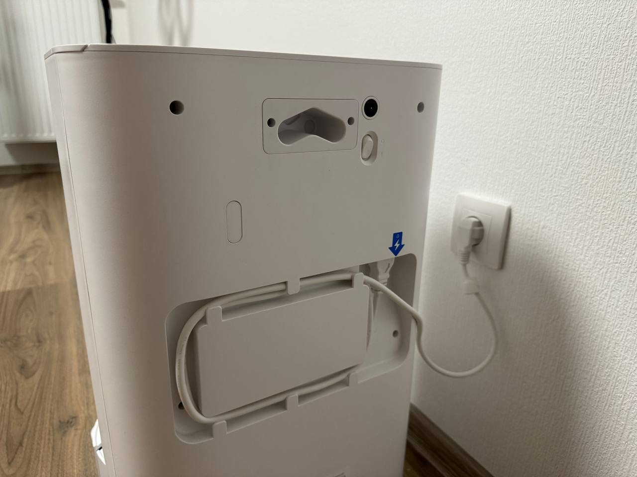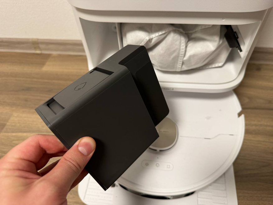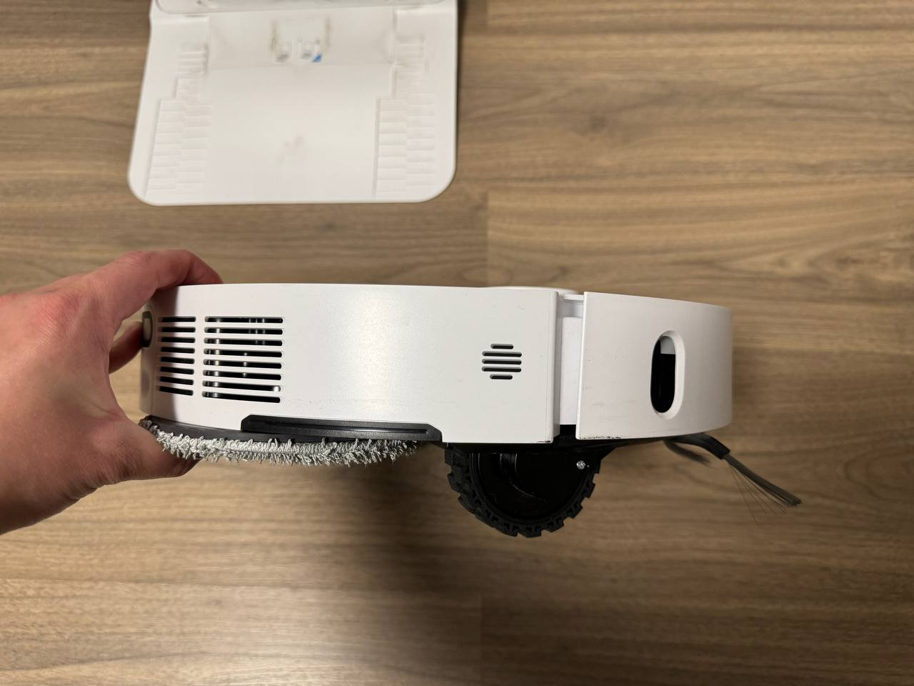 На задней части базы есть место для кабель-менеджмента, отверстие для выдуваемого воздуха, кнопка вкл/выкл и разъём для подключения станции к сети. Если пылесос подключен к водопроводу, обслуживание сводится к замене мусорных мешков. Под заглушкой с левой стороны расположен резервный коннектор для обновления прошивки базы, который в основном используется для диагностики в случае неисправностей. Обновление также можно осуществлять через приложение Mi Home. В комплекте есть дезодорирующее средство и два мопа, которые удобно крепятся на липучки.
