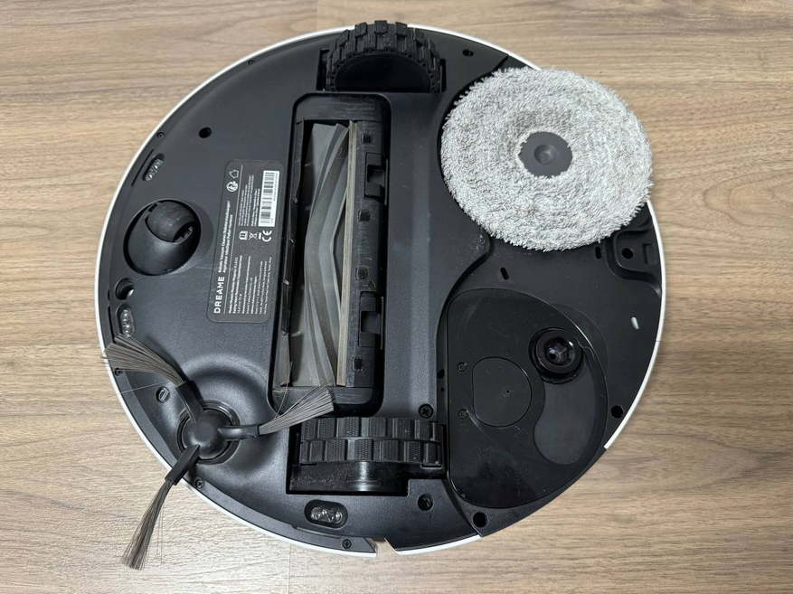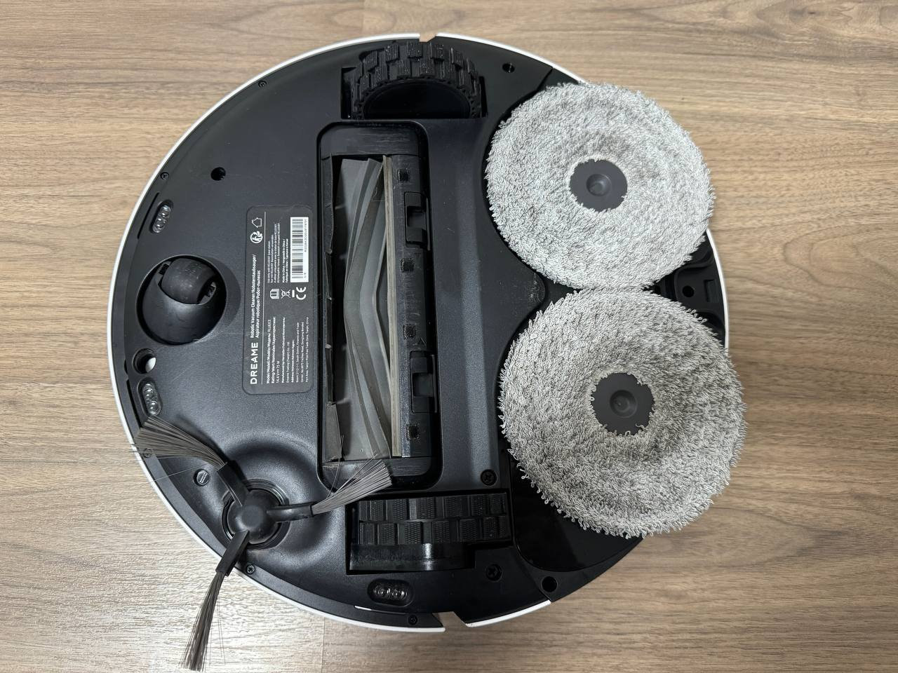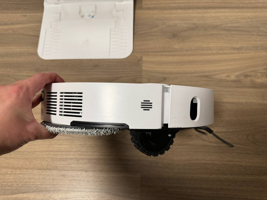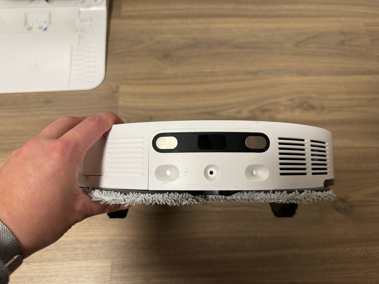 Также в нижней части базы есть 2 подпружиненных контакта для зарядки и коннектор для заполнения бака воды. Вода подаётся в чашу и заполняет внутренний резервуар робота. Два отверстия для выдува грязи из пылесборника и 2 отверстия для обдува валиков горячим воздухом. Установлен ИК датчик для парковки робота.