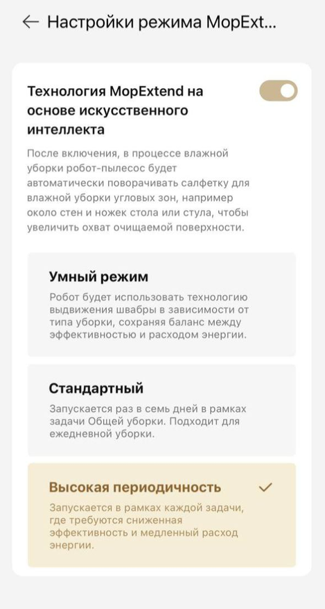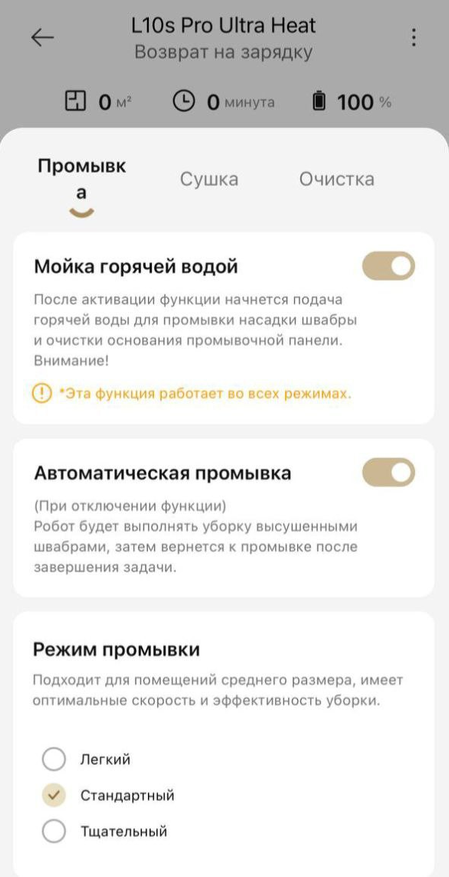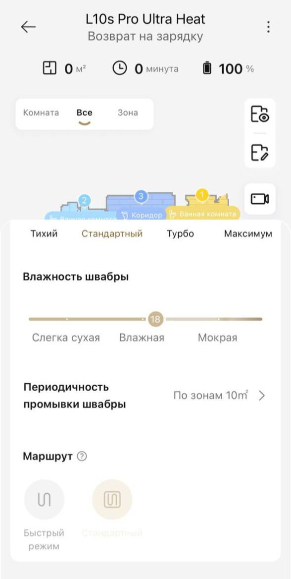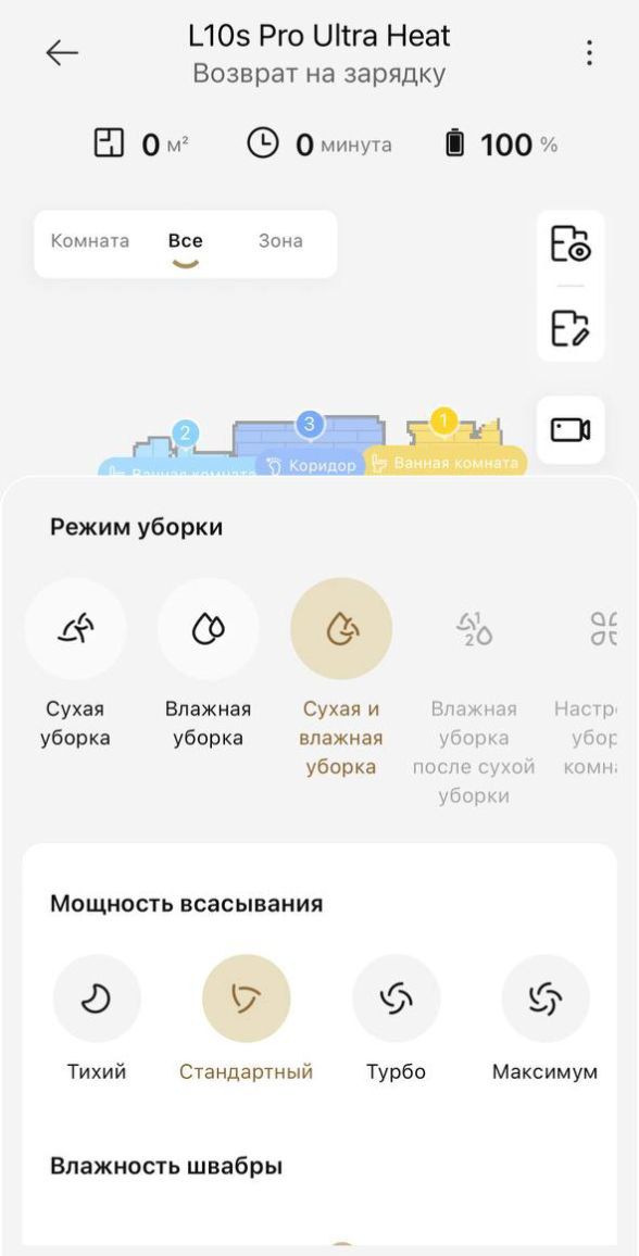 Настройка влажности швабры: слегка сухая, влажная, мокрая. Установка периодичности промывки швабры: к заданному времени, по комнатам, по метражу.