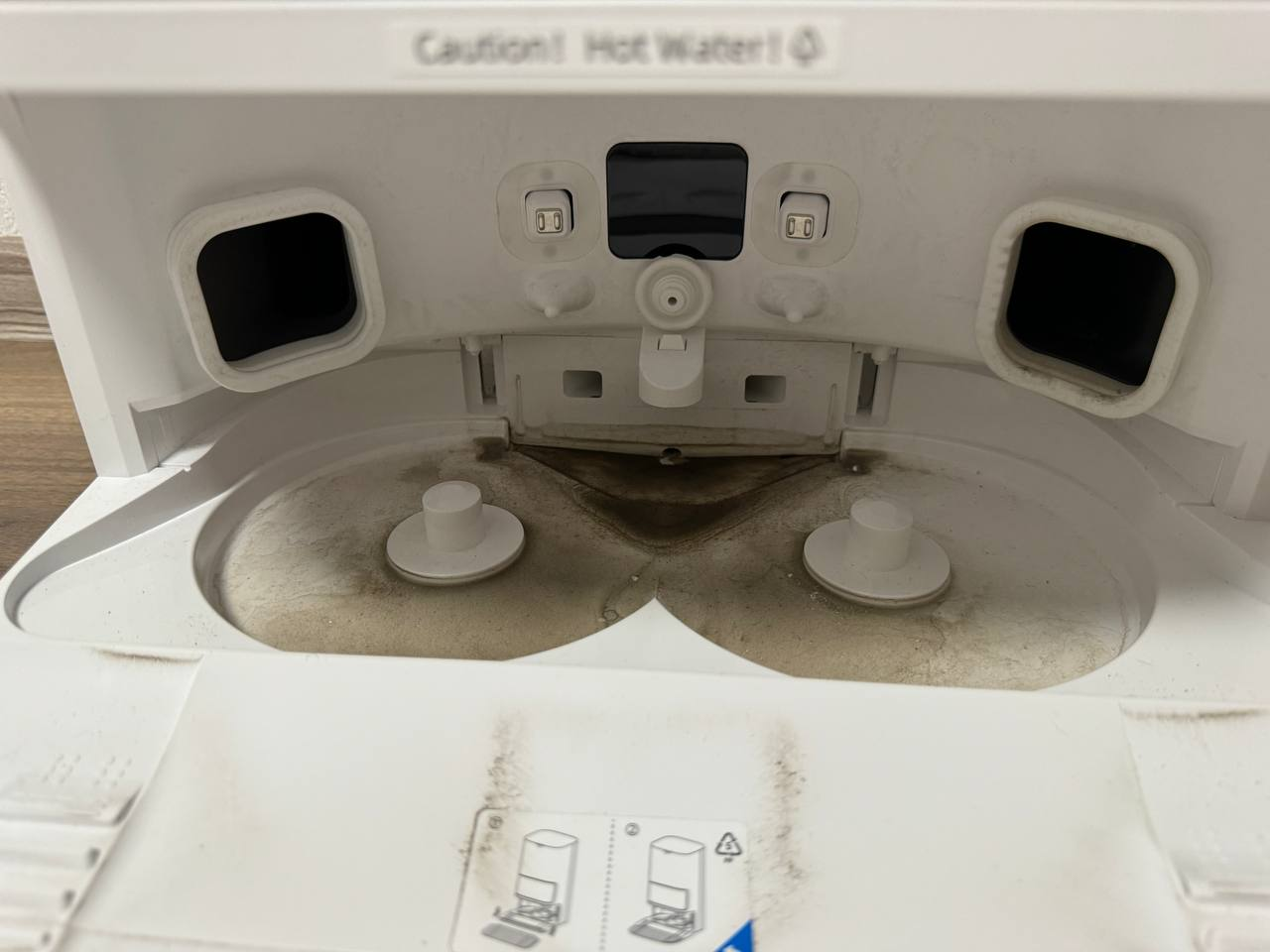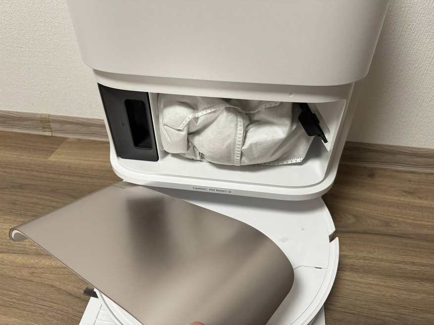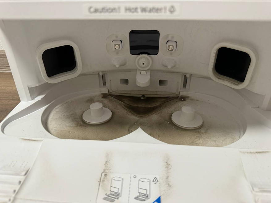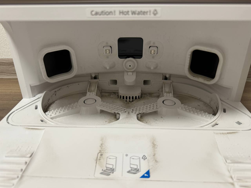 Под отсеком установлена плоская чаша с ребрами для оттирания мопов, которую можно снять и промыть пространство под ней с использованием комплектного ёршика, после чего база сама засосёт грязную воду.