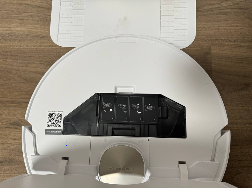 Подкапотное пространство содержит резервуар для пыли и грязи объемом 0,3 л. В нём установлен нестандартный фильтр, сетка средней дисперсности и обратный клапан. Также есть кнопка Reset и QR код для загрузки приложения.
