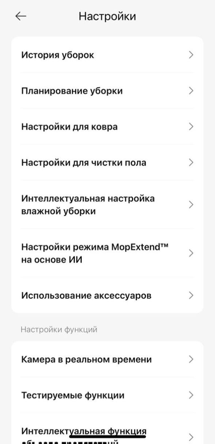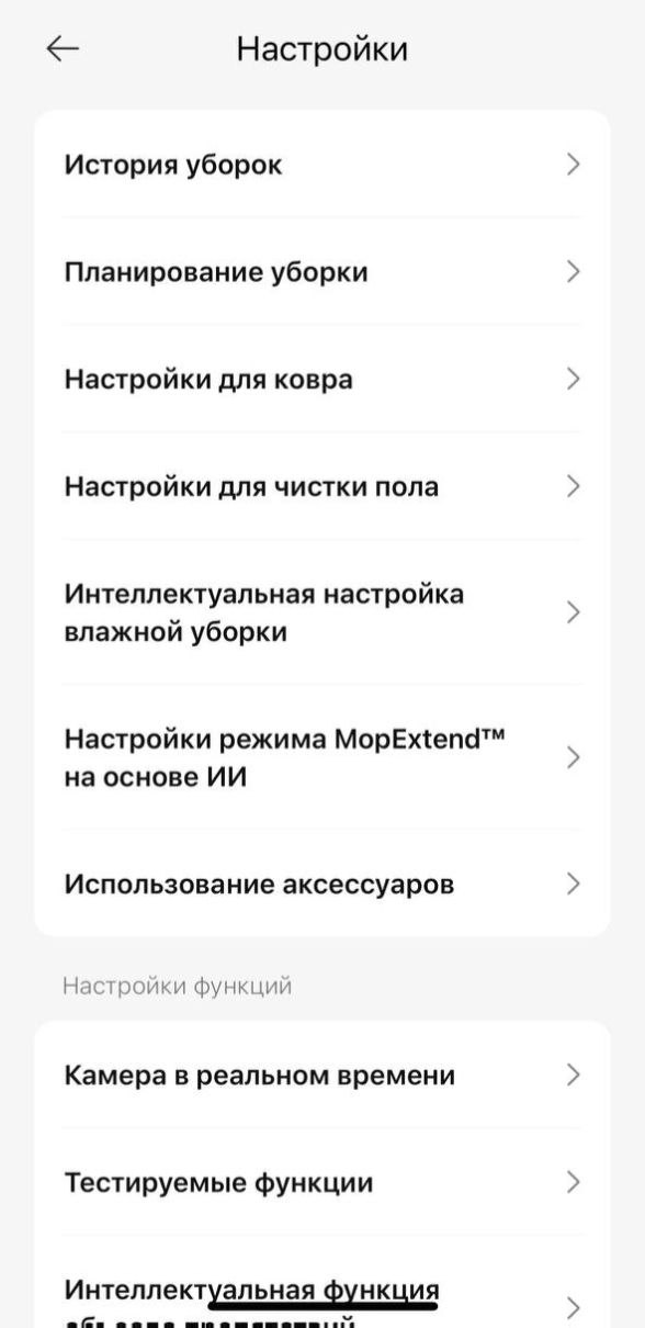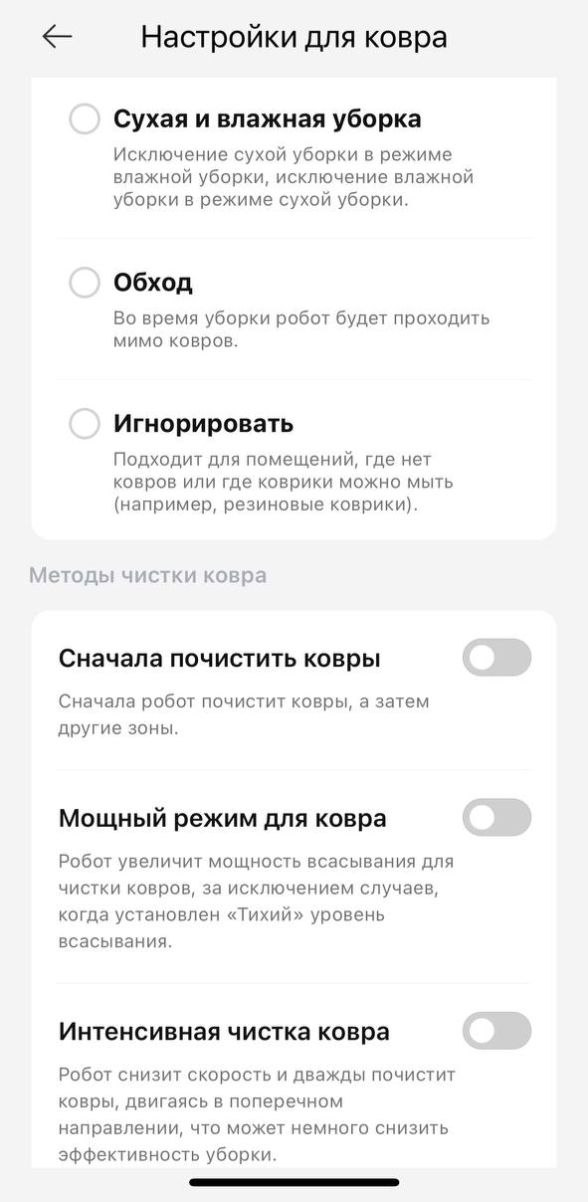 Настройка уборки на коврах: сухая уборка, сухая и влажная уборка, обход, игнорировать. Методы чистки ковра: сначала почистить ковры, мощный режим для ковра, интенсивная чистка ковра. При интенсивной чистке ковра робот снизит скорость и дважды почистит ковёр.