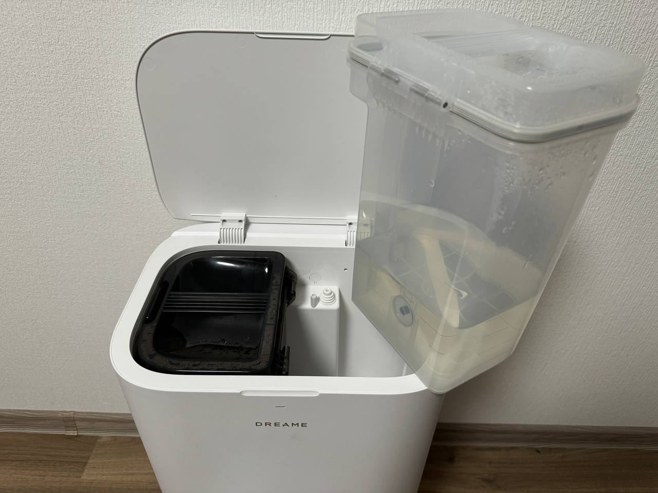 В нижней части базы есть отдельный отсек для мешка сбора мусора и пластиковый контейнер для дезодорирующей жидкости.