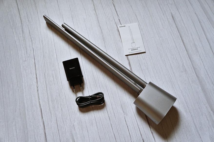 Настольная лампа поставляется в качественной фирменной упаковке с хорошей полиграфией. Удобно, что можно заказать сразу в комплекте с зарядным устройством: