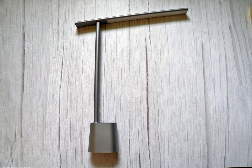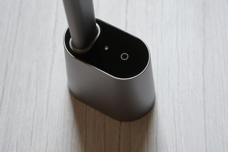 Нижний блок выглядит как рубка подводной лодки, сверху находится глянцевая пластина с кружком сенсора и окошком датчика внешнего освещения. Смотрится стильно, но не очень практично, на глянцевой поверхности остаются отпечатки пальцев при касании сенсора. «Глазок» датчика яркости активируется при переводе лампы в режим адаптивного освещения, в этом режиме при включении лампы, она сама оценивает степень окружающего освещения и автоматически адаптирует уровень собственной яркости. Например, если лампа включена при наступлении вечерних сумерек, с их усилением и приходом темноты за окном, светильник постепенно самостоятельно увеличивает увеличивает яркость. Тоже самое происходит, в обратном направлении, если внешнее освещение усиливается — лампа понижает яркость.