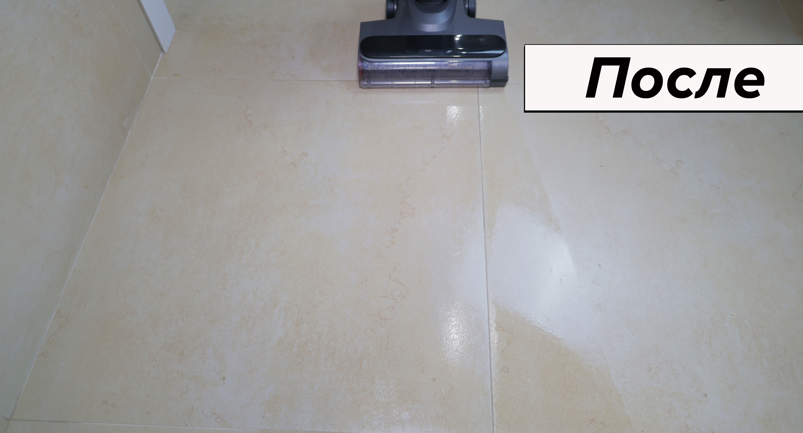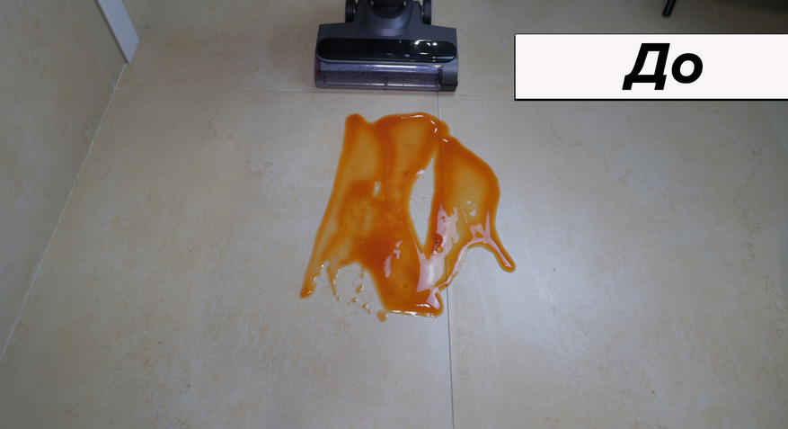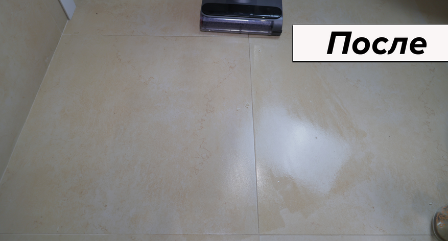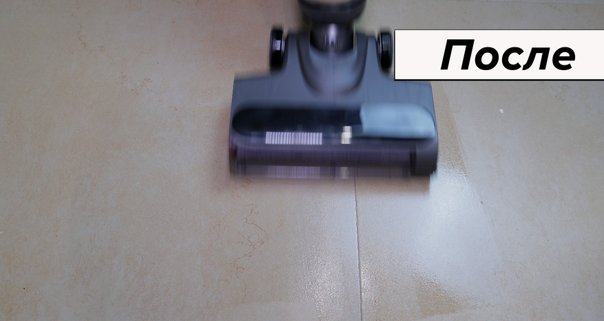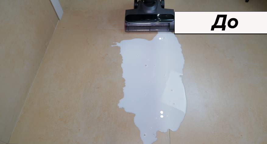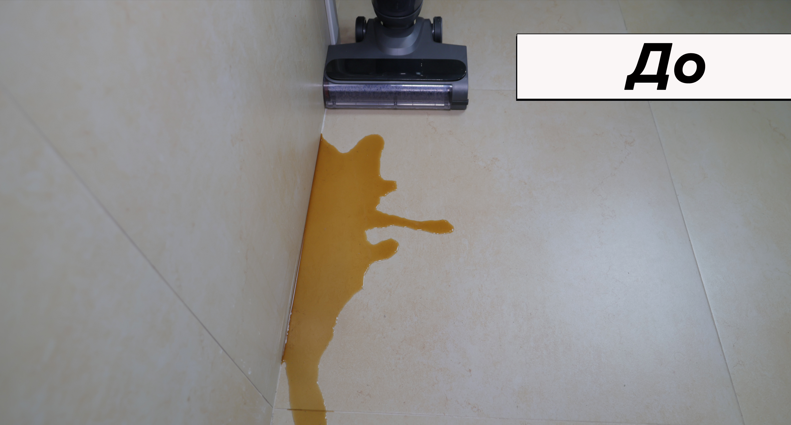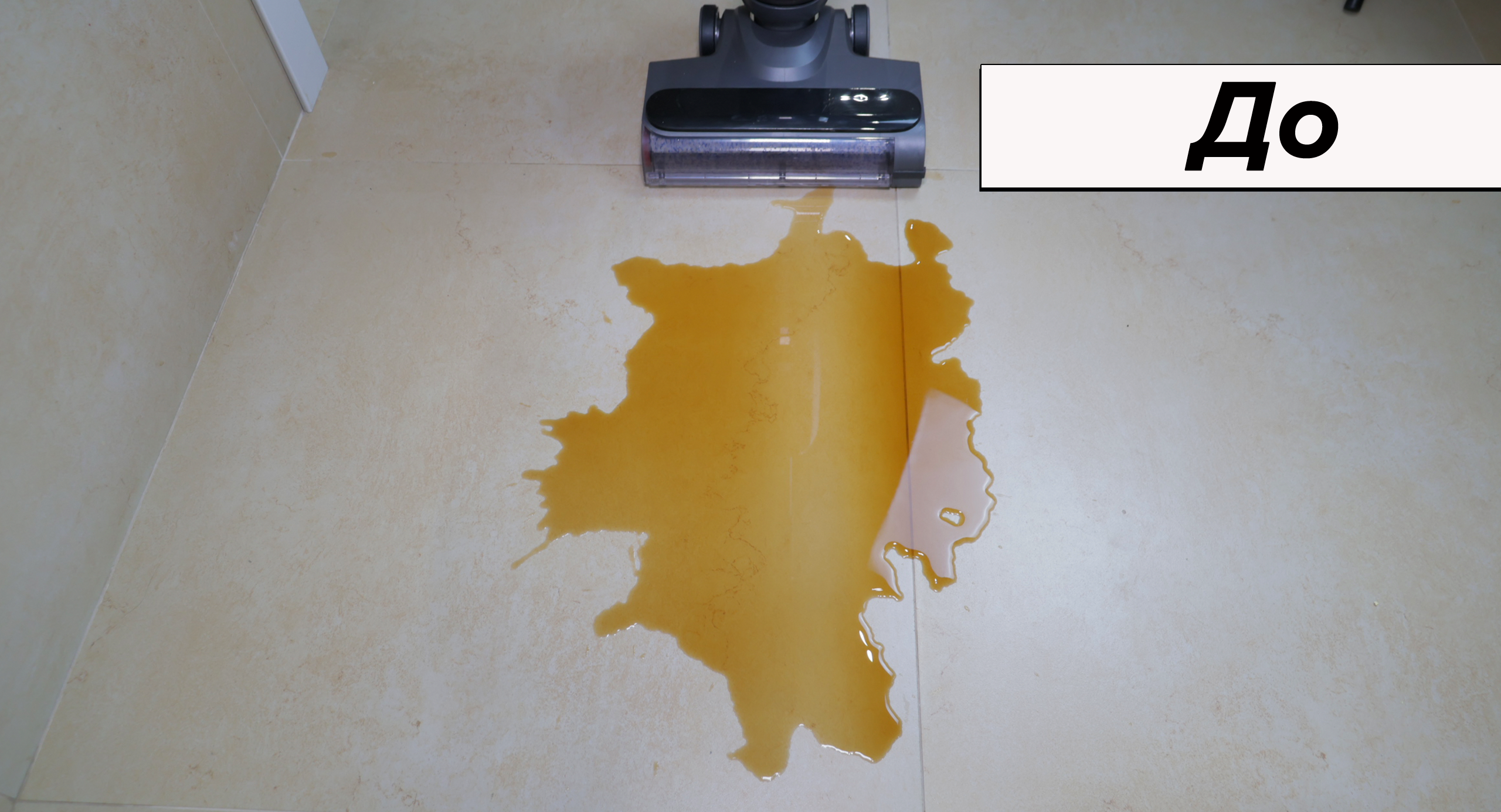 Разлитые жидкости: собирает адекватно, включая участки у плинтуса, но пол остаётся влажным — это важно учитывать.
