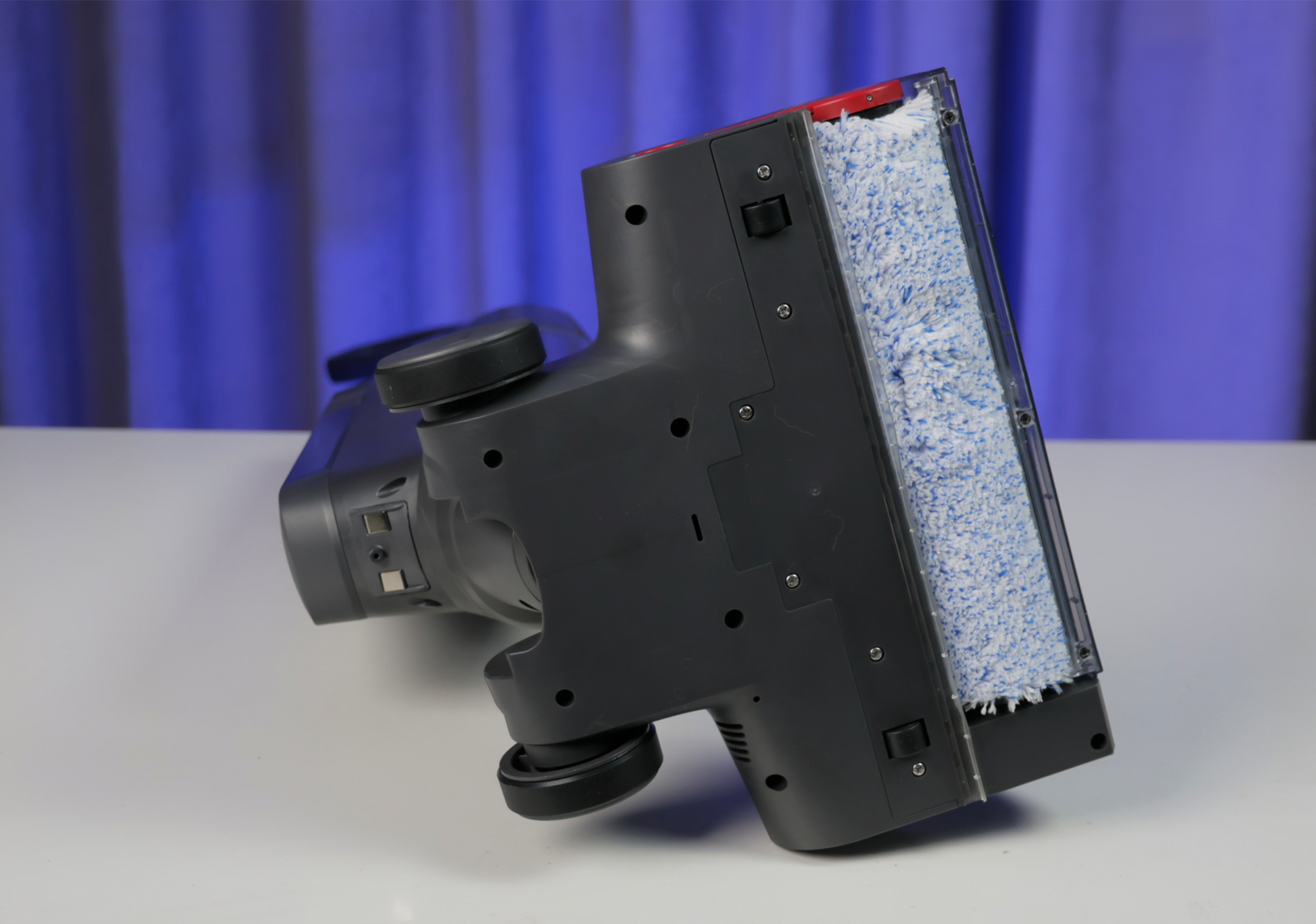 «Лапа», как и положено современному пылесосу, ассиметричная. Валик выходит к стене. Смачивание происходит через 8 форсунок в раструбе.
