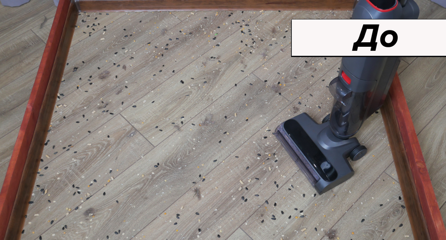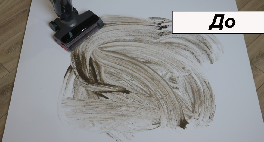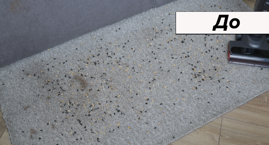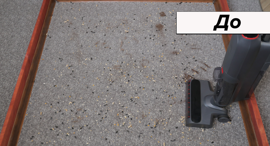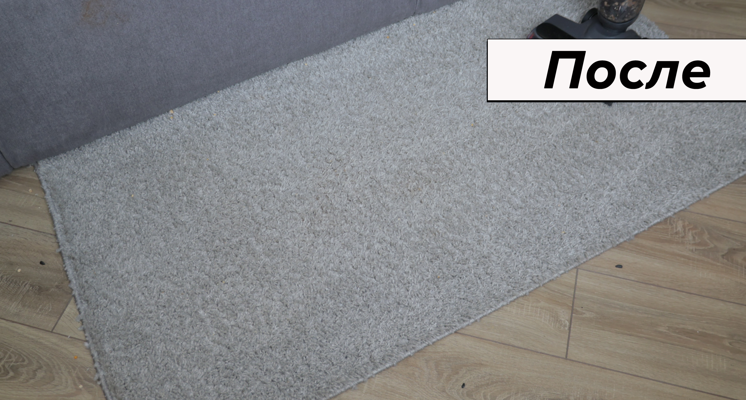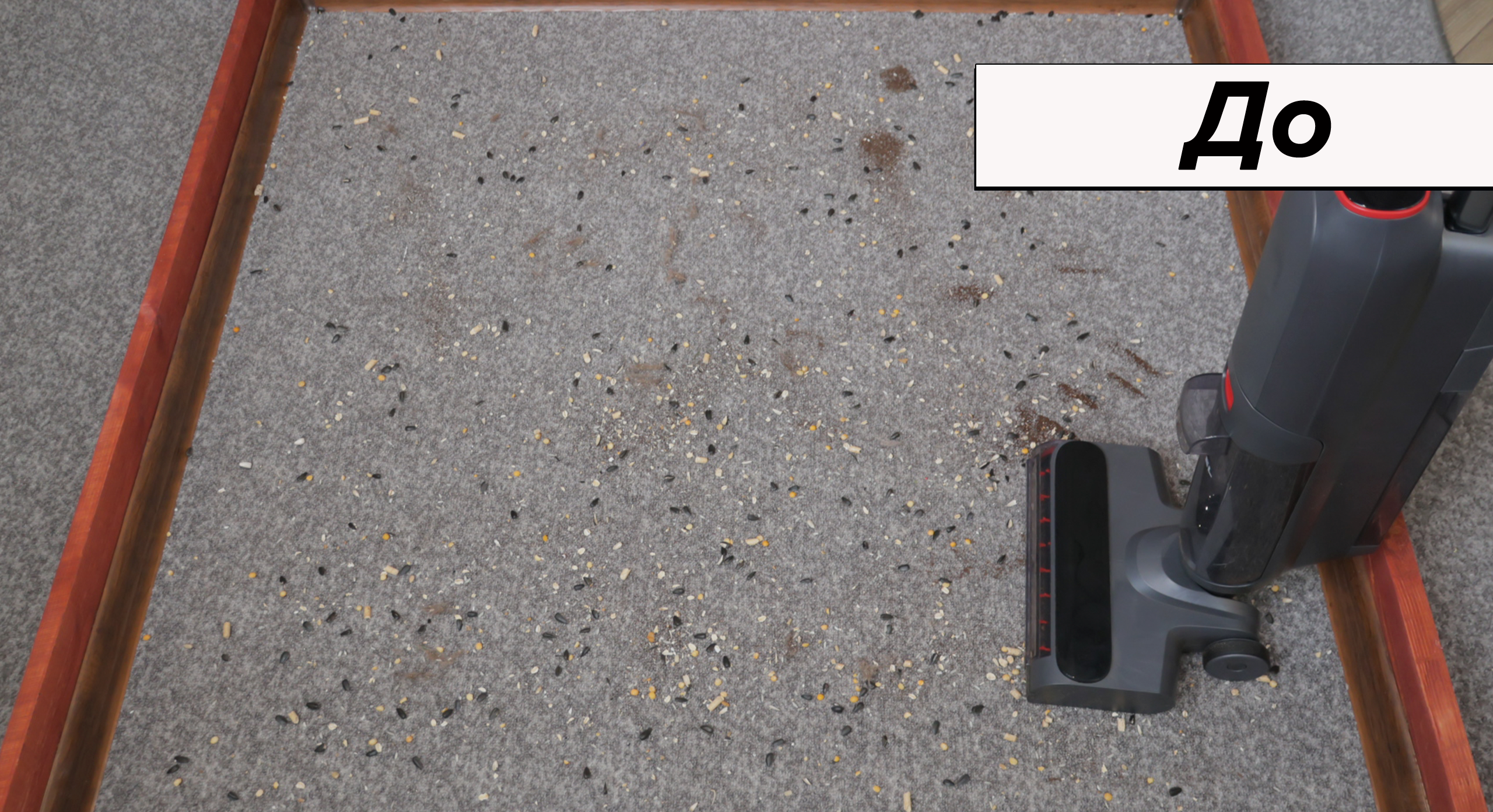 На мягких покрытиях уже не обойтись без щетинистой щётки. Ковролин пылесос убирает начисто, только приходится делать дополнительный проход. На тяжелом ковре махать нужно гораздо дольше, но главное, что удаётся добиться результата — поверхность полностью чистая, да и в глубине соринок практически не осталось!