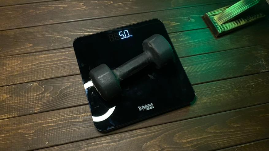 Как уже говорил ранее, весы начинают работать автоматически, для этого необходимо только встать на них. В принципе, для людей, кто хочет просто время от времени измерять вес, этого уже достаточно и весы SkyBalance RS-744S с этим отлично справляются. Например, на следующей фотографии можете увидеть на весах гантели ровно на 5 килограмм.