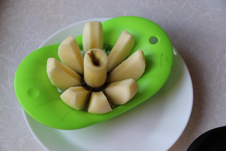Опционально можно одним движением разрезать на дольки. Но эта концепция мне не очень понравилась: во-первых, довольно большая часть уходит в огрызок. Во-вторых, усилие резки довольно большое, ножи тут не такие острые, как на машинке.