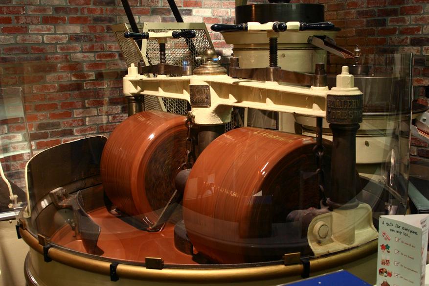 Индустриальный прорыв произошёл в конце XIX века, когда в Швейцарии была изобретена конш-машина — предшественник современных меланжеров. Её создал Рудольф Линдт, желая улучшить текстуру шоколада. Конширование позволяло не только тщательно измельчить массу, но и «вытянуть» из неё лишние кислоты, улучшая аромат и структуру. Принцип оказался столь удачным, что лёг в основу современных меланжеров.