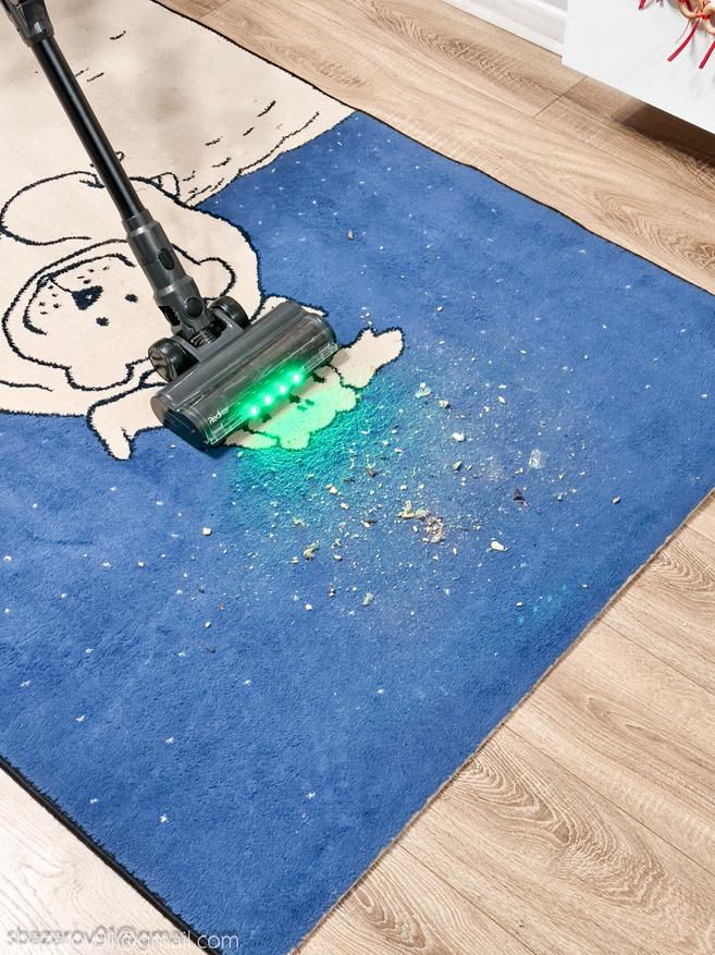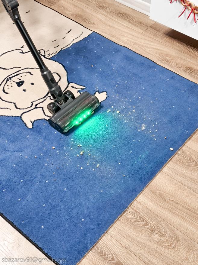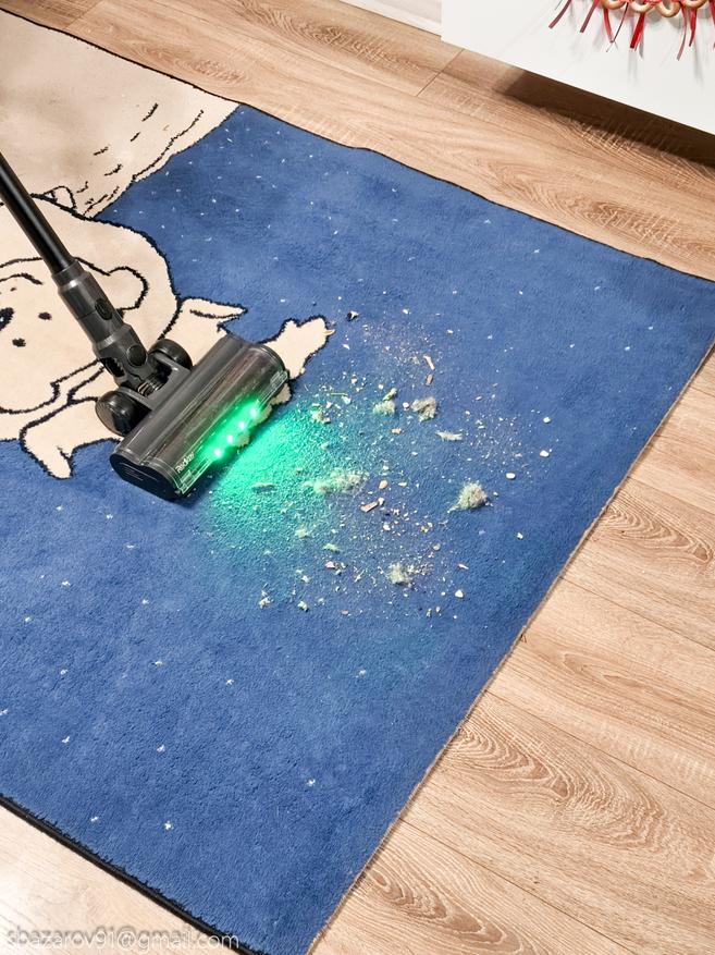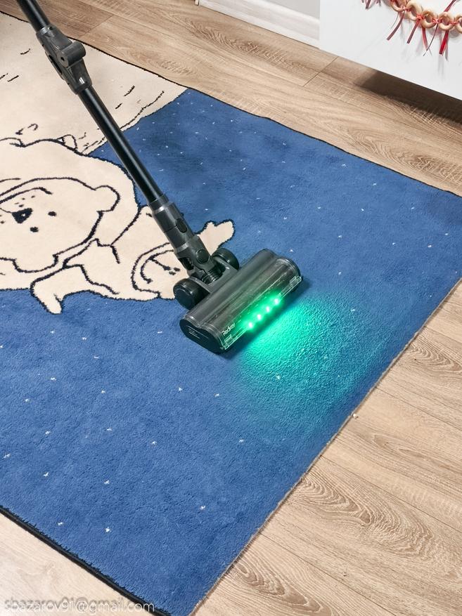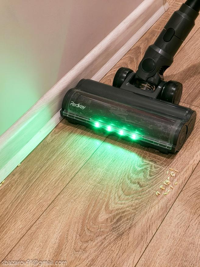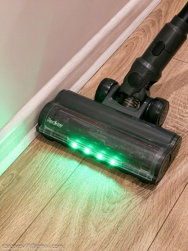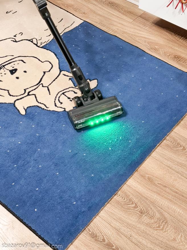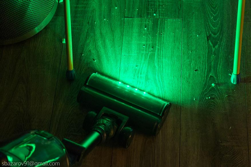 Начнём с зелёной подсветки, которая активируется автоматически вместе с пылесосом. Её источник — четыре светодиода, расположенные под расчётным углом для наилучшего освещения поверхности. Главное преимущество такого зелёного света перед белым — его способность эффектно подсвечивать любой мусор, значительно повышая его видимость во время уборки. Если для лучшей работы белых светодиодов приходится выключать основной свет в комнате, то зеленая отлично справляется в любое время.