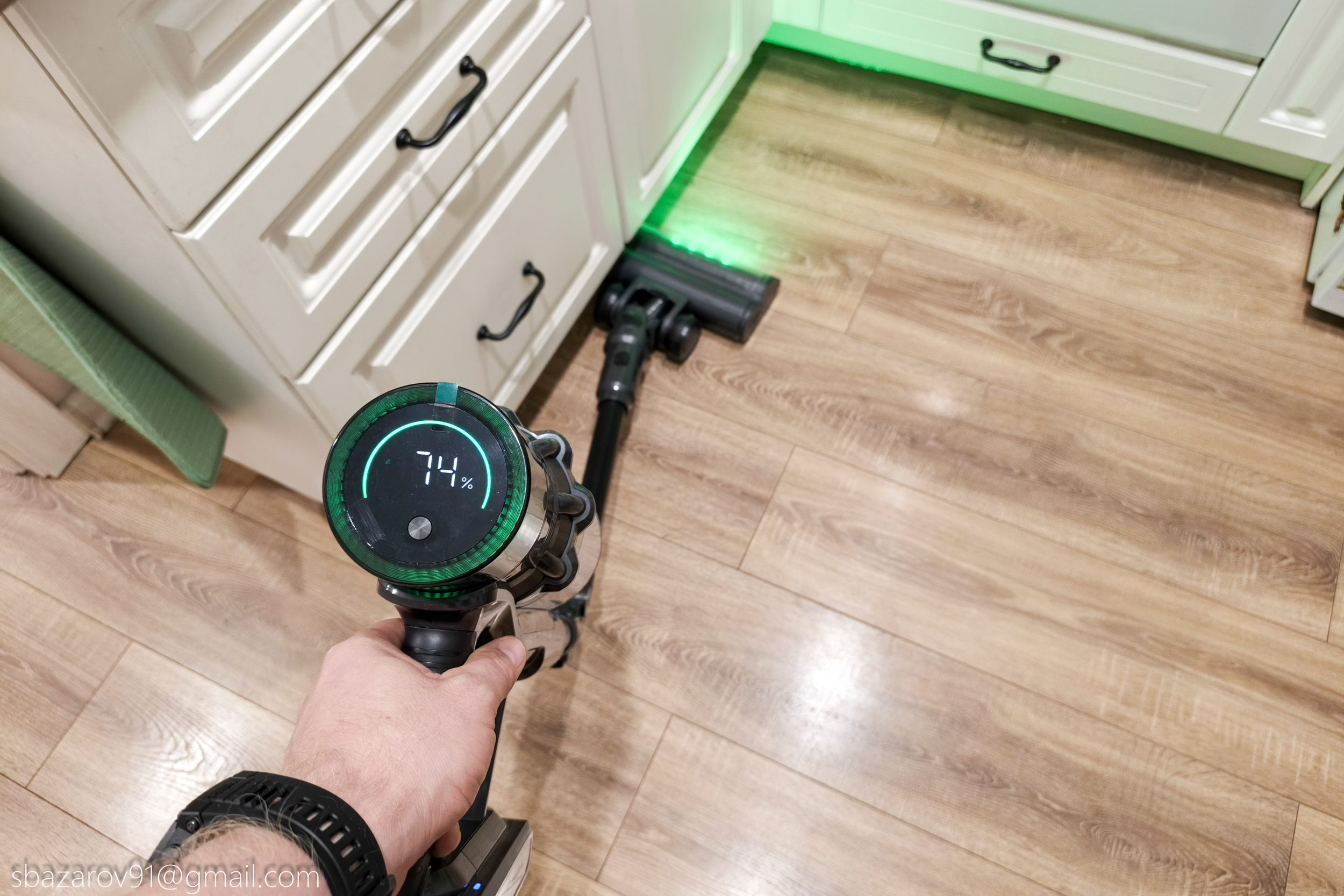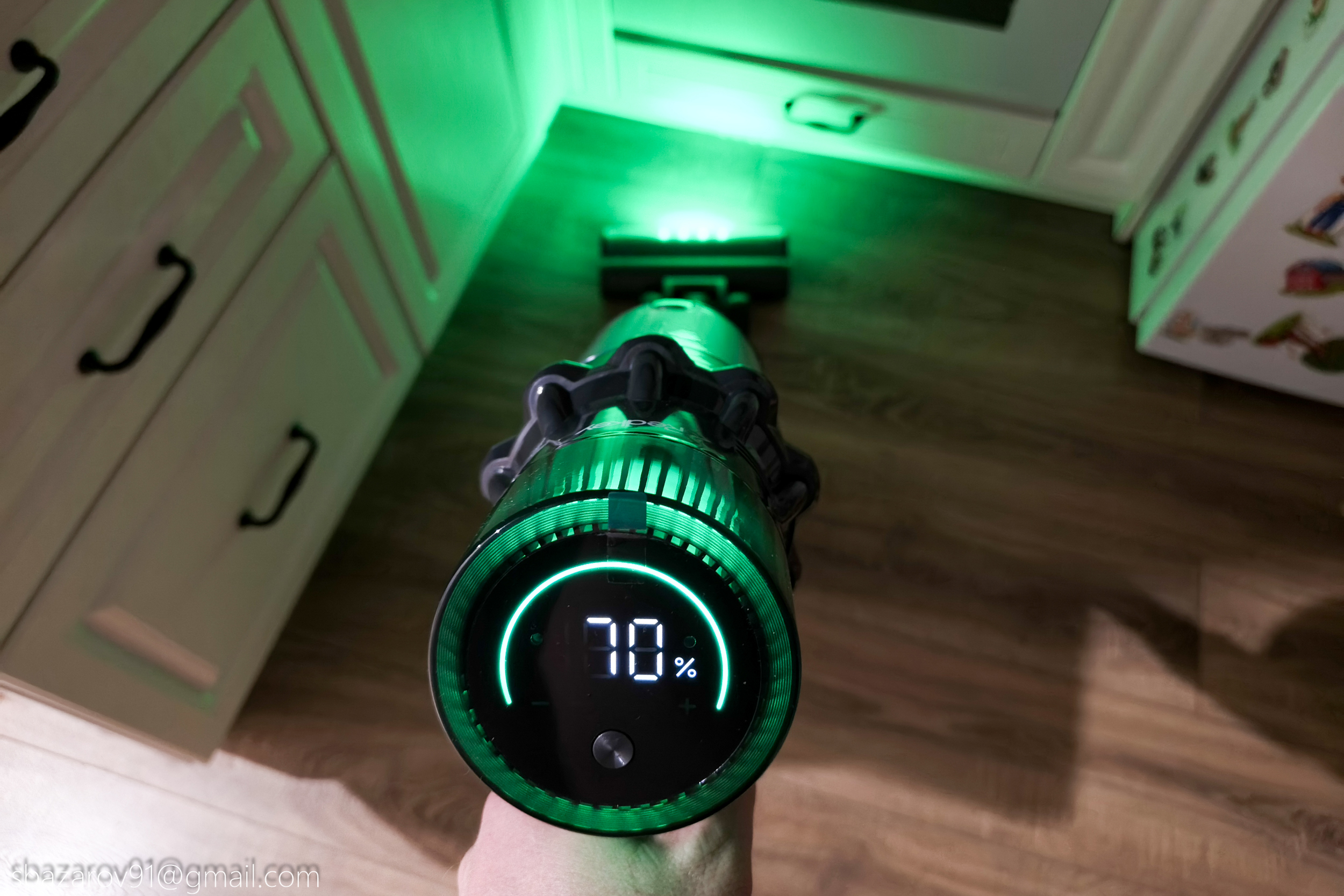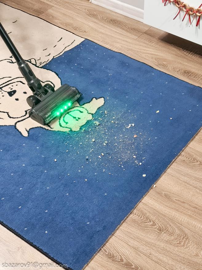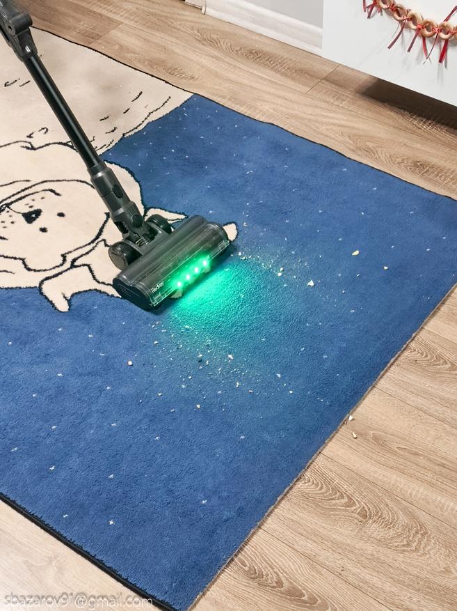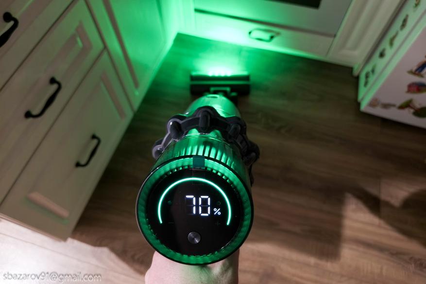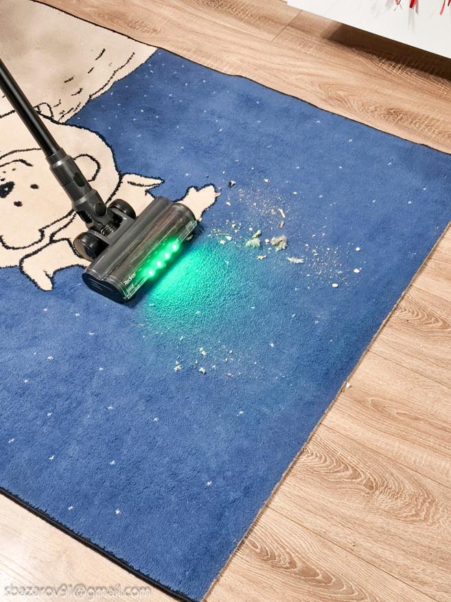 Начнём с зелёной подсветки, которая активируется автоматически вместе с пылесосом. Её источник — четыре светодиода, расположенные под расчётным углом для наилучшего освещения поверхности. Главное преимущество такого зелёного света перед белым — его способность эффектно подсвечивать любой мусор, значительно повышая его видимость во время уборки. Если для лучшей работы белых светодиодов приходится выключать основной свет в комнате, то зеленая отлично справляется в любое время.