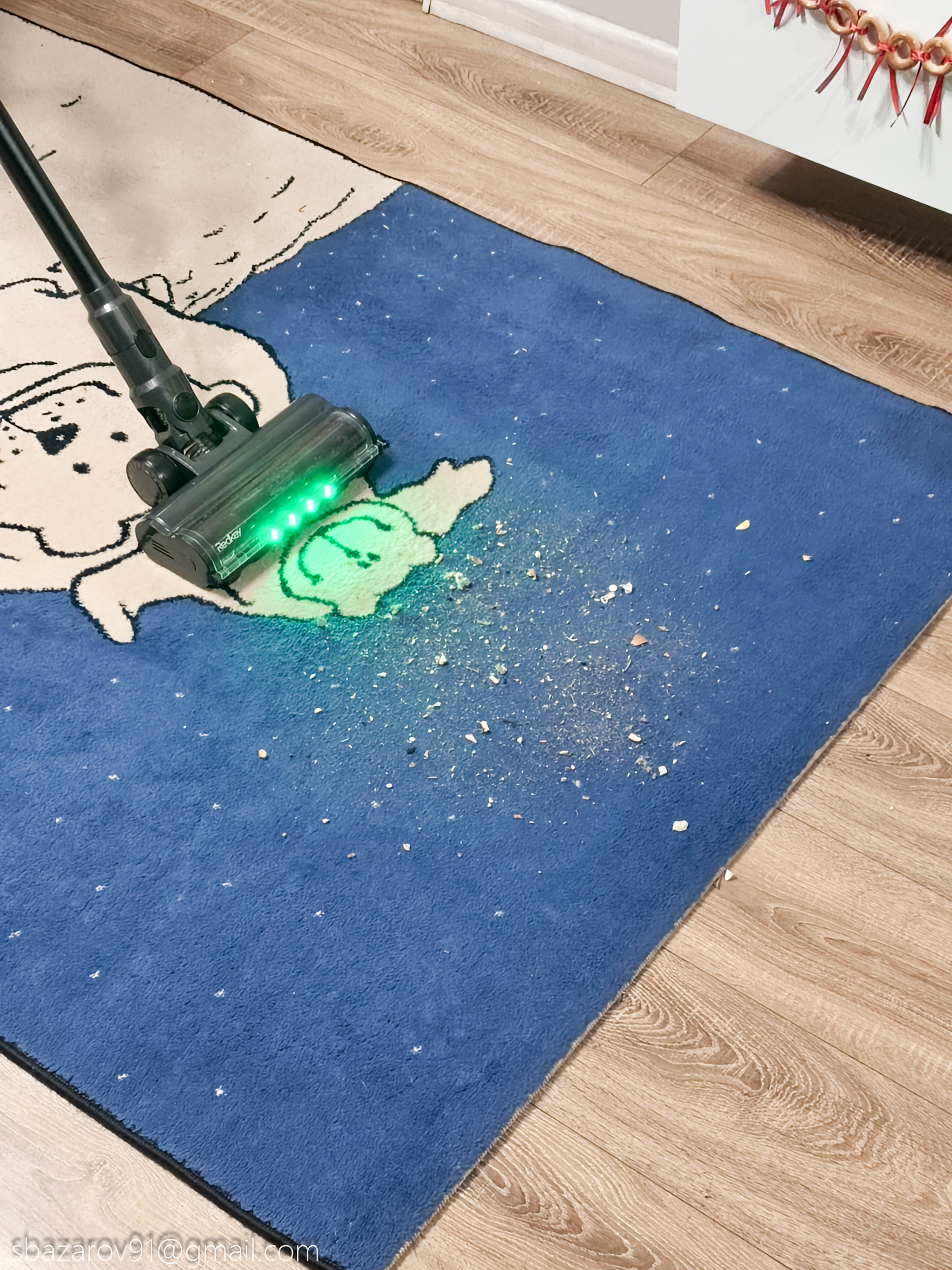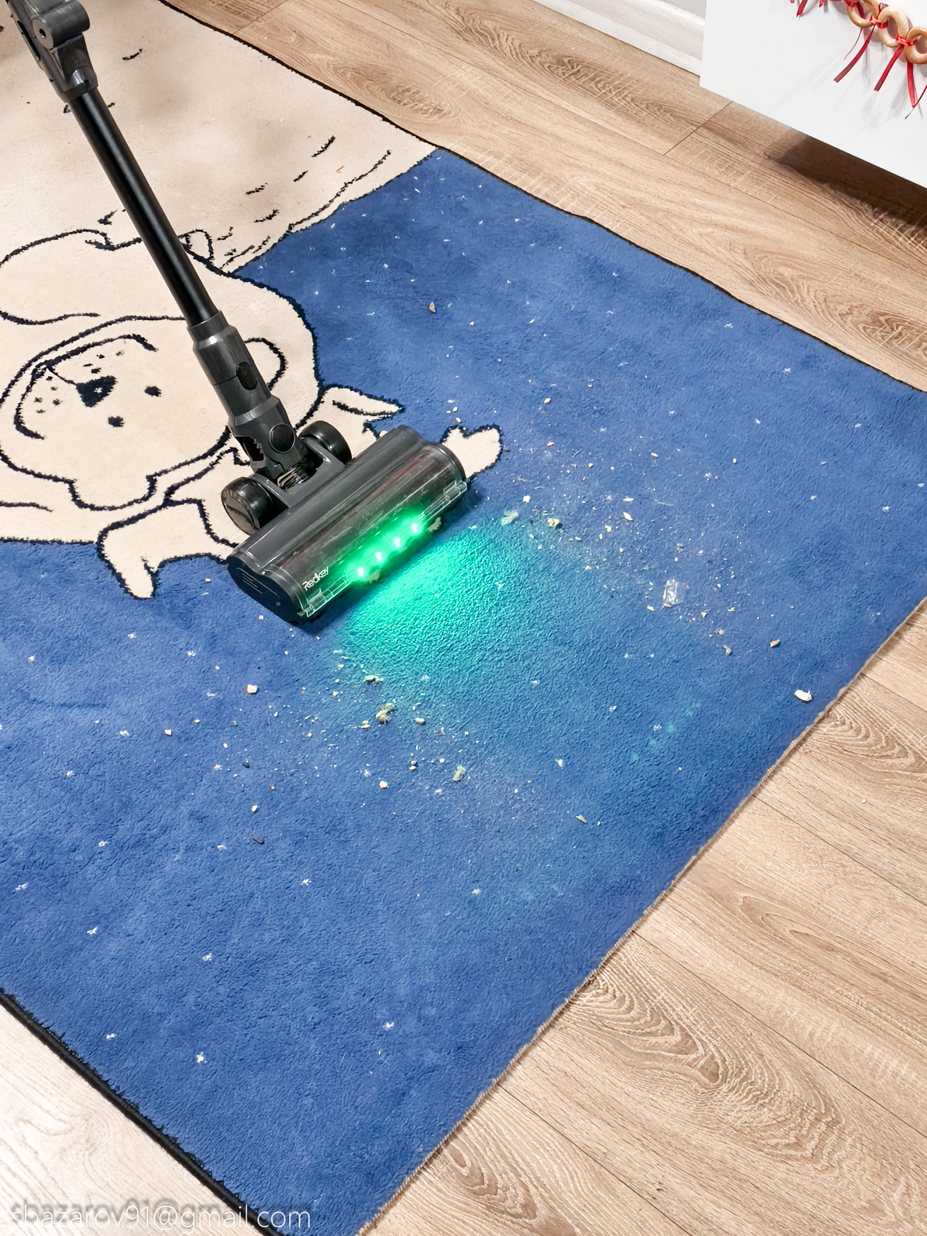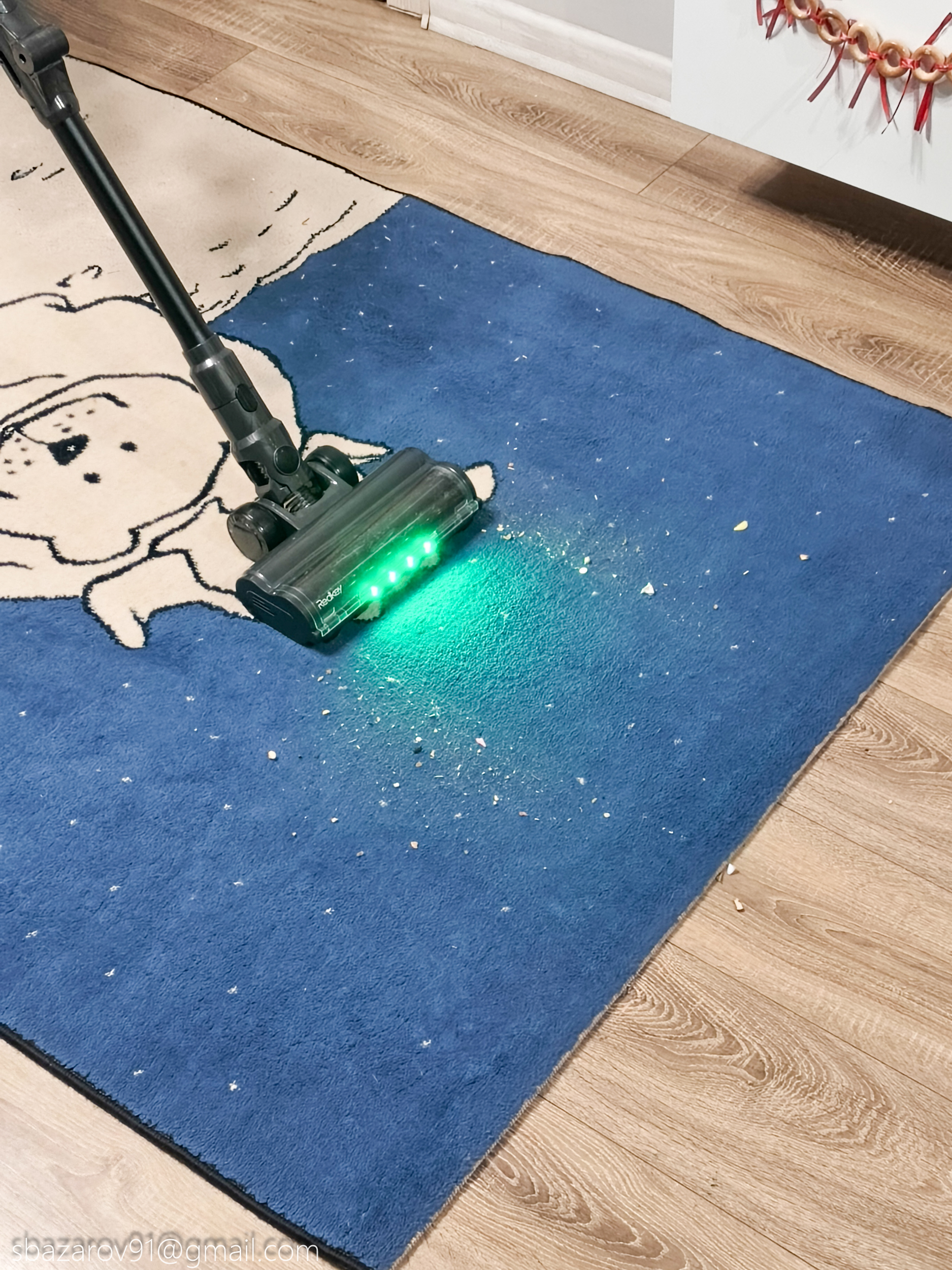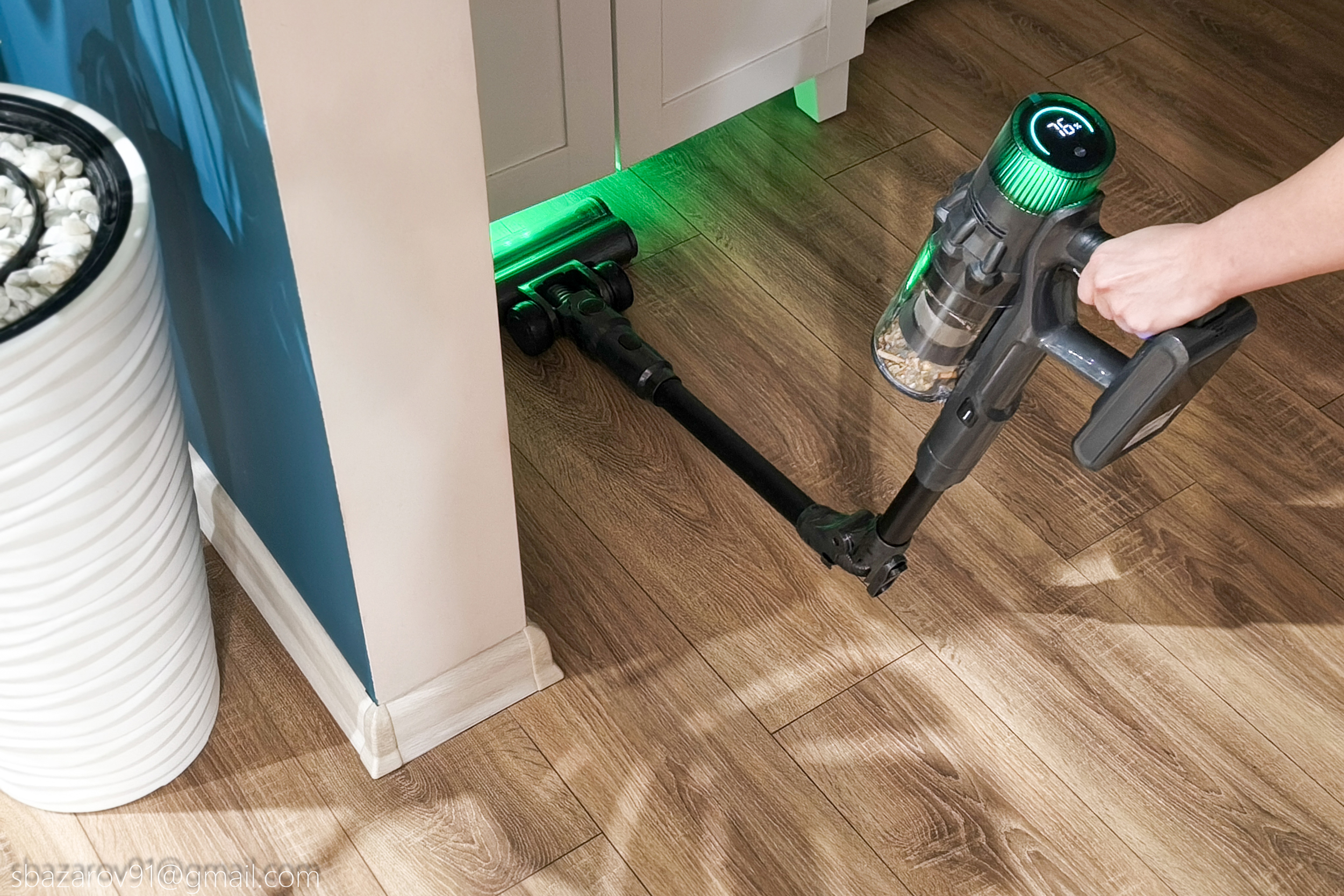 Начнём с зелёной подсветки, которая активируется автоматически вместе с пылесосом. Её источник — четыре светодиода, расположенные под расчётным углом для наилучшего освещения поверхности. Главное преимущество такого зелёного света перед белым — его способность эффектно подсвечивать любой мусор, значительно повышая его видимость во время уборки. Если для лучшей работы белых светодиодов приходится выключать основной свет в комнате, то зеленая отлично справляется в любое время.