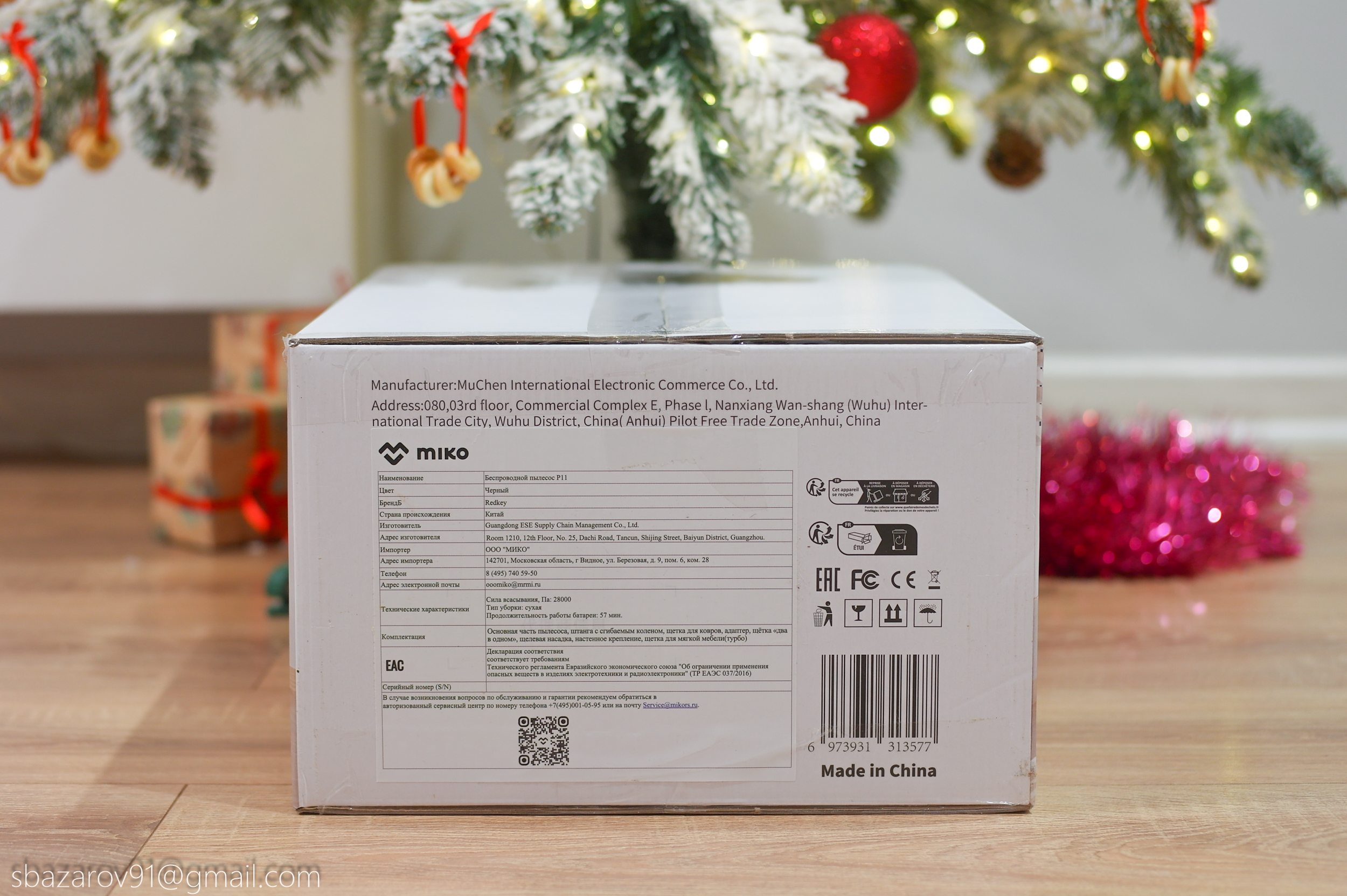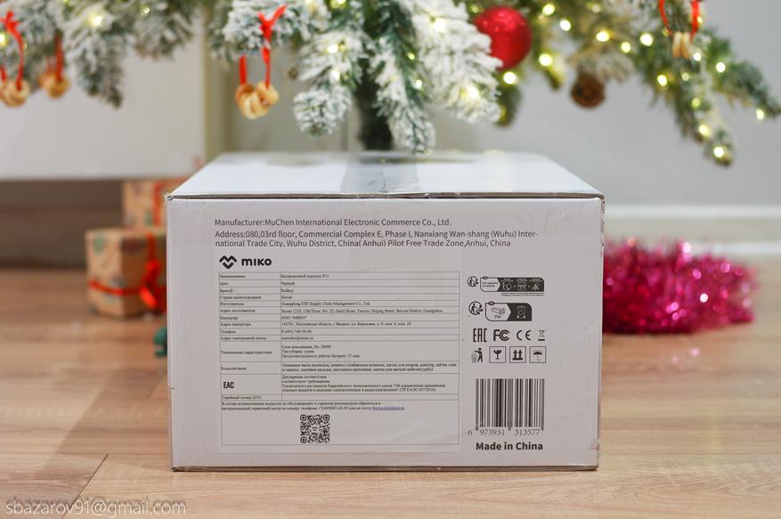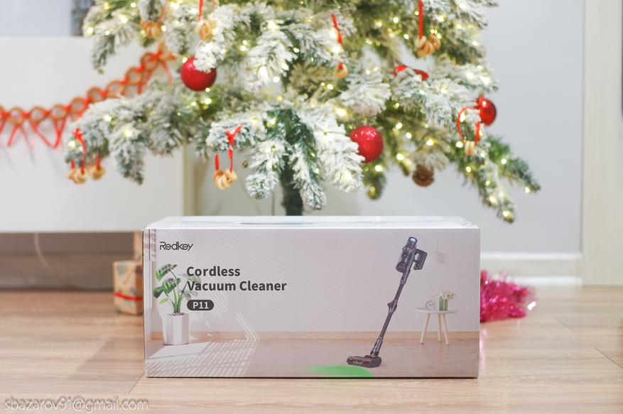 Redkey P11 поставляется в компактной коробке белого цвета. На лицевой стороне можно увидеть вертикальный пылесос в сборе, где демонстрируется одна из главных особенностей — зеленая подсветка для обнаружения пыли. Что касается характеристик пылесоса, то они проиллюстрированы на боковой стороне коробки.