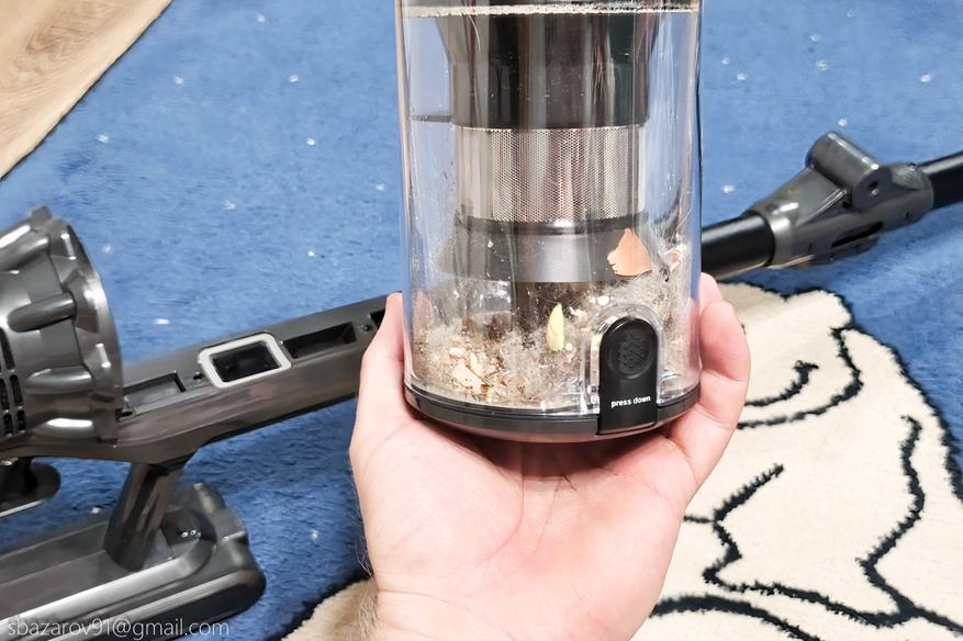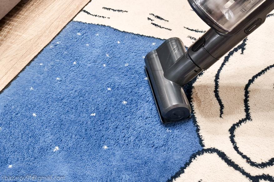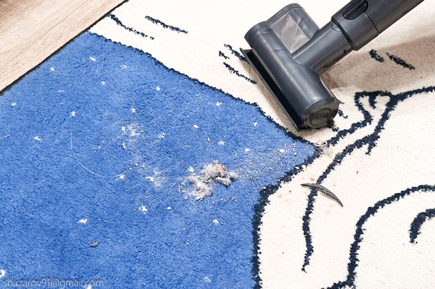 Тестовый мусор включал мелкие частицы (песок, пыль, крошки печенья), которые глубоко забиваются в ворс ковра, что создаёт дополнительные сложности при очистке. Даже в минимальном режиме мощности пылесос обеспечивает качественную уборку, хотя для идеального результата в этом случае требуется уже два прохода вместо одного.