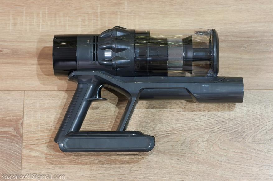 Корпус пылесоса выполнен из глянцевого пластика темного цвета. Органы управления расположены классическим образом: спусковая кнопка, включающая сам пылесос, на рукоятке; кнопка отщелкивания резервуара с мусором на основном корпусе; кнопка смены режимов работы с торца пылесоса.
