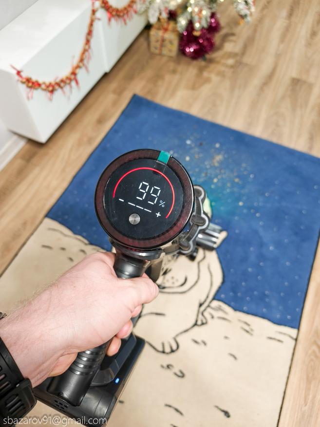 В основании рукоятки съемный аккумулятор. Его емкость — 2200 мА*ч, выходное напряжением 29,6 В. У Redkey P11 есть три режима мощности, которые расходуют заряд по-разному. На практике это выглядит так (во всех режимах используется гибкий шланг и напольная щетка):