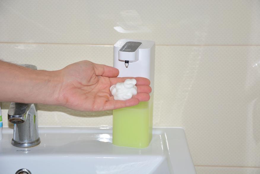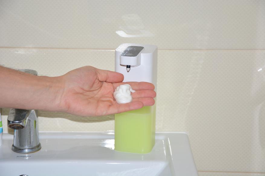 Пожалуй, из минусов диспенсера можно отметить отсутствие меток на резервуаре, хотя это и не критично. В то же время дозатор отличается аккуратной сборкой, применением качественных материалов, неожиданно для техники такого класса расширенной комплектацией и богатым набором режимов — четыре режима разной длительности выдачи пены, один очистки, сигнализации загрязнения датчика приближения. Конструктивно он устойчив благодаря квадратному сечению корпуса с широкими сторонами. Забыл отметить индикацию разряда аккумулятора — частые пятикратные моргания всех светодиодов. Пока этого не наблюдал так, как пользуемся только полтора месяца, а для семьи из пяти человек это уже длительная автономность. Не удивлюсь, если через какое-то время дозатор подтянут в эколинейки Xiaomi или иных брендов.